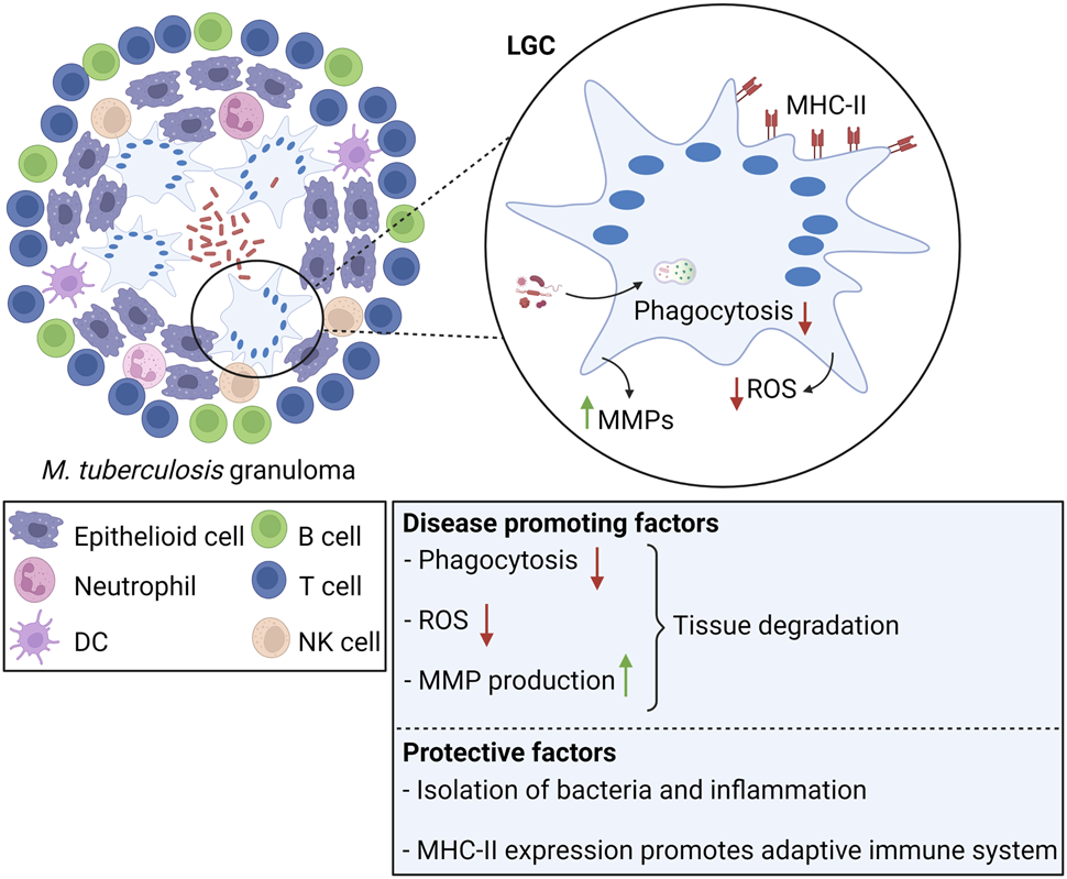 Langhans giant cells in tuberculosis. LGCs are a hallmark of M. tuberculosis-induced granulomas. In tuberculosis, LGCs exhibit both protective and disease promoting factors. Clearance of M. tuberculosis is inefficient since LGCs cannot mediate bacterial uptake or sufficient ROS production for pathogen killing. Additionally, LGCs secrete MMPs leading to tissue destruction. On the other hand, LGCs are involved in isolation of bacteria and inflammation from the surrounding tissue. LGCs highly express MHC-II molecules, suggesting that they promote the adaptive immune response through antigen presentation.