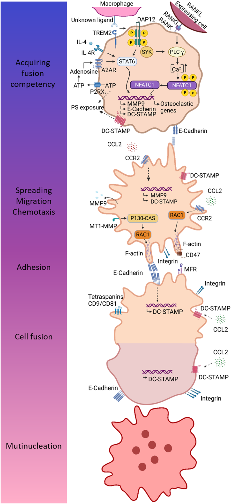 Different steps in the multinucleation process mainly based on findings in osteoclasts. MGCs originate from macrophage fusion, a multi-step process comprising acquirement of fusion competency, chemotaxis and adhesion, and finally cell fusion resulting into multinucleation. Fusion competency is accomplished through upregulation of fusogens downstream of signaling through so-called prefusion mediators. DAP12 and its associated receptor TREM2 are well-established prefusion mediators. After binding of its unknown ligand, TREM2 associates with DAP12 leading to phosphorylation of DAP12 and downstream signaling via SYK. In IL-4 induced fusion, DAP12-mediated signaling results in activation of STAT6 and subsequent induction of several fusogens, including MMP9, E-cadherin, and DC-STAMP. During osteoclastogenesis, combined action of RANK- and DAP12-mediated signaling leads to Ca2+ signaling downstream of PLCγ, resulting in an increase of intracellular Ca2+ concentration enabling translocation of NFATc1 to the nucleus. Fusogens are induced by combined action of P2RX7 and A2A receptor. ATP release through P2RX7 provides extracellular ATP for biosynthesis of adenosine, which in turn induces fusion competency by binding to A2A receptor. Fusing macrophages are characterized by exposure of PS, a lipid that is normally localized in the inner membrane leaflet. The mechanism of PS externalization may involve P2RX7 and DC-STAMP. Macrophage chemotaxis is driven by CCL2 and is essential to bring the membranes of two individual cells in close proximity for fusion. Next to chemotaxis, CCL2 is hypothesized to mediate the induction of fusogens, including MMP9 and DC-STAMP. In order to allow cell migration and subsequent cell adhesion, macrophages undergo cytoskeletal arrangements, which are mediated by RAC1, a major regulator of the cytoskeleton. It has been established that MT-MMP1 activates RAC1. Furthermore, CCL2 signaling has also been associated with RAC1 activation. Homotypic cell-cell adhesion is mediated by integrins and E-cadherin. The latter might also be involved in induction of fusogens, such as DC-STAMP. Cell-cell attachment is dependent on interaction between CD47 and MFR. Once macrophages are firmly attached to each other, the real fusion process can proceed. DC-STAMP is considered a main fusion regulator; however, its ligand and mechanism of action remain to be defined. Several putative ligands for DC-STAMP has been proposed, including CCL2, MFR, and CD47.