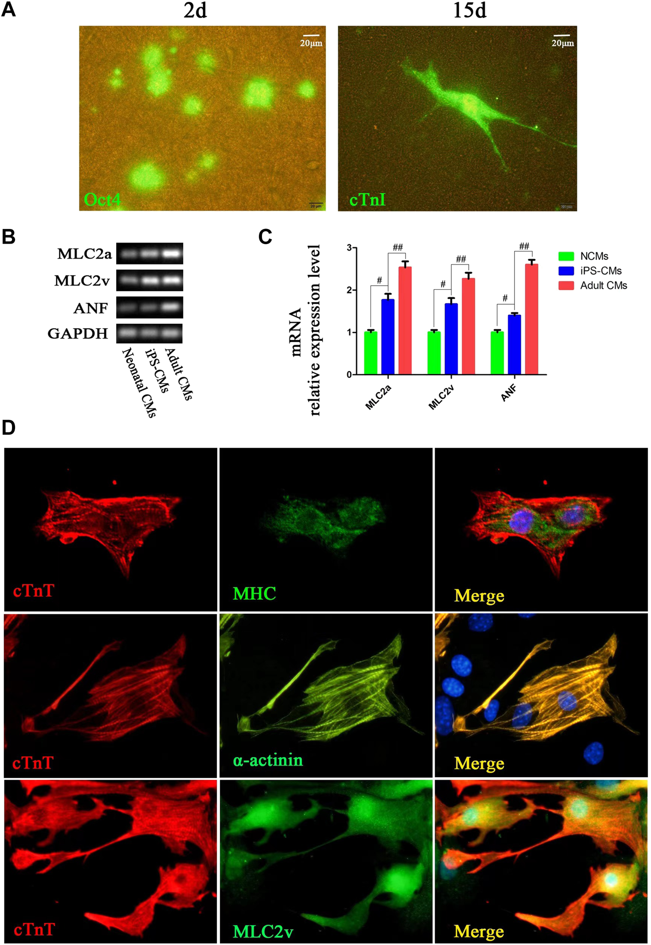 CMs was differentiated from hPSCs cultured on 3D nanofibrous scaffold. (A) Fluorescence expression of Oct4 (day 2) and cTnI (day 15) in differentiation. (B,C) RT-PCR analysis of cardiac-specific gene expression in differentiated iPSC-CMs cultured with 3D nano-scaffolds, NCMs and adult CMs. (D) Immunofluorescence co-staining of cTnT with MHC, α-actinin and MLC2v in cells at day 15 of differentiation on 3D nanofibrous scaffolds to identify the CM phenotype.