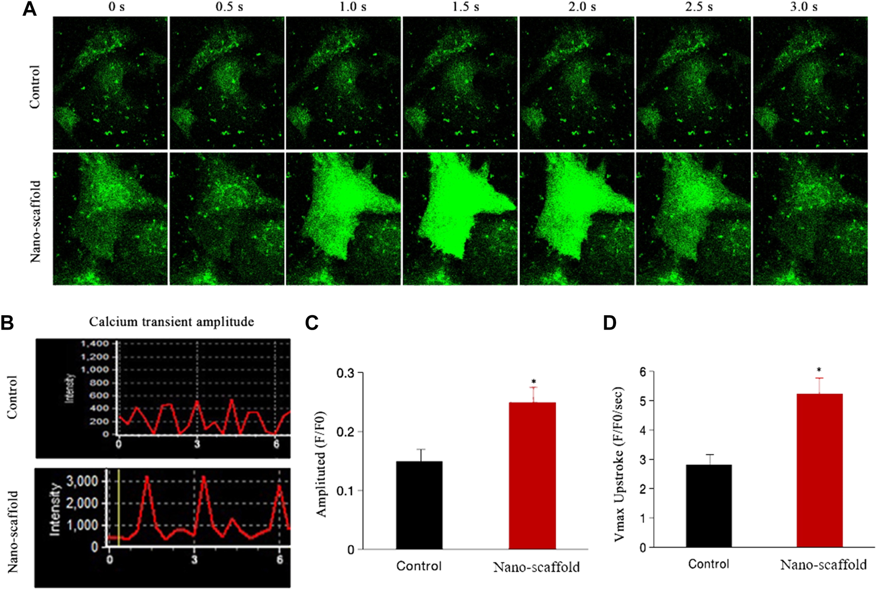 Calcium transient was assessed in iPSC-CMs cultured on nanofibrous scaffold. (A) Representative line-scan of time-lapse calcium imaging in iPSC-CMs loaded with the intracellular calcium indicator Fluo-4 AM. (B) Representative records of spontaneous calcium transient. (C) Comparison of calcium transient peak amplitude between two groups. (D) Comparison of Vmax (F/F0/s) between two groups. Data are presented as mean ± SEM, *p < 0.05 vs. control.