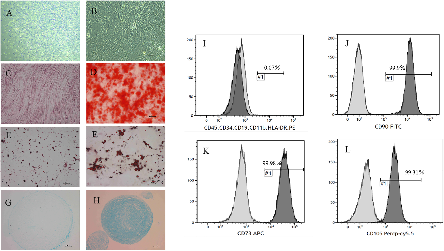 Morphology and phenotype identification of UC-MSC. The morphology of UC-MSC is shown at ×50 magnification (A) or at ×200 magnification (B). (C,D) UC-MSC were successfully differentiated into osteoblasts, which were verified by Alizarin Red staining. Representative photos were taken of the control group (C) and the induction group (D) at ×100 magnification. (E,F) UC-MSC were successfully differentiated into adipocytes through oil red “O” staining. Representative photos were taken of the control group (E) and the induction group (F) at ×200 magnification. (G,H) UC-MSC were successfully differentiated into the cartilage cells, which were identified by simple blue dye. Representative photos were taken of the control group (G) and the induction group (H) at ×100 magnification. The surface markers of UC-MSC, including CD90, CD105, CD73, CD45, CD34, CD11b, CD19, and HLA-DR, were analyzed by flow cytometry. Among them, the positive rates of CD90, CD105, and CD73 were above 99%. Others were almost always negatively expressed (I–L).