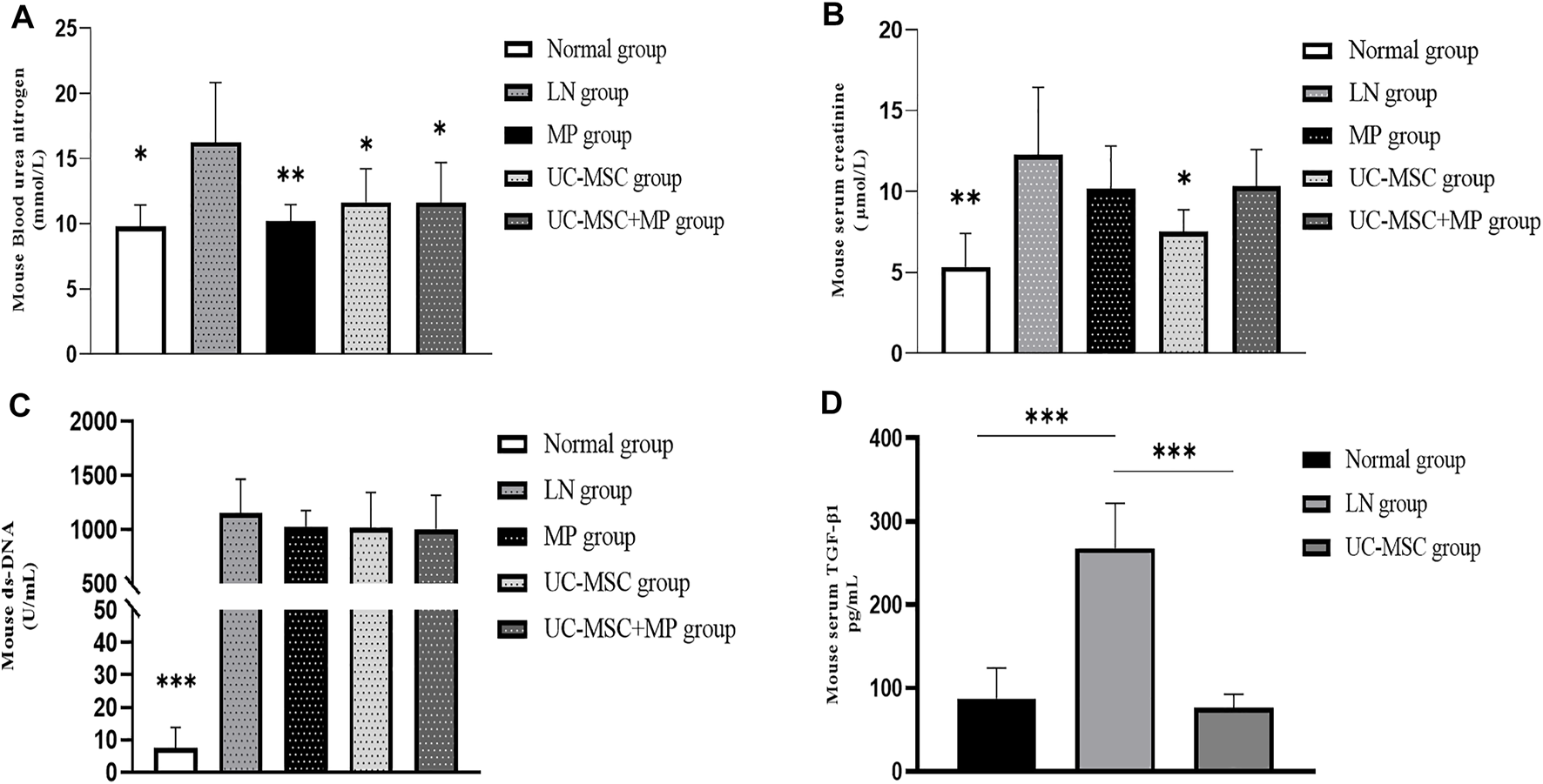 Compared with the normal group, the LN group showed significant increases in ds-DNA, creatinine, and urea nitrogen, indicating that the modeling of LN mice was successful. Compared with the LN group, lower urea nitrogen levels were observed in the MP group (p < 0.01) and UC-MSC + MP group (p < 0.05), and lower levels of creatinine and urea nitrogen (p < 0.05) were observed in the UC-MSC group. There were no significant differences between the UC-MSC and MP groups in terms of ds-DNA, creatinine, and urea nitrogen. These results revealed that UC-MSC therapy showed the same effects as MP treatment on improving the renal function in MRL/Ipr mice (Figure 2).