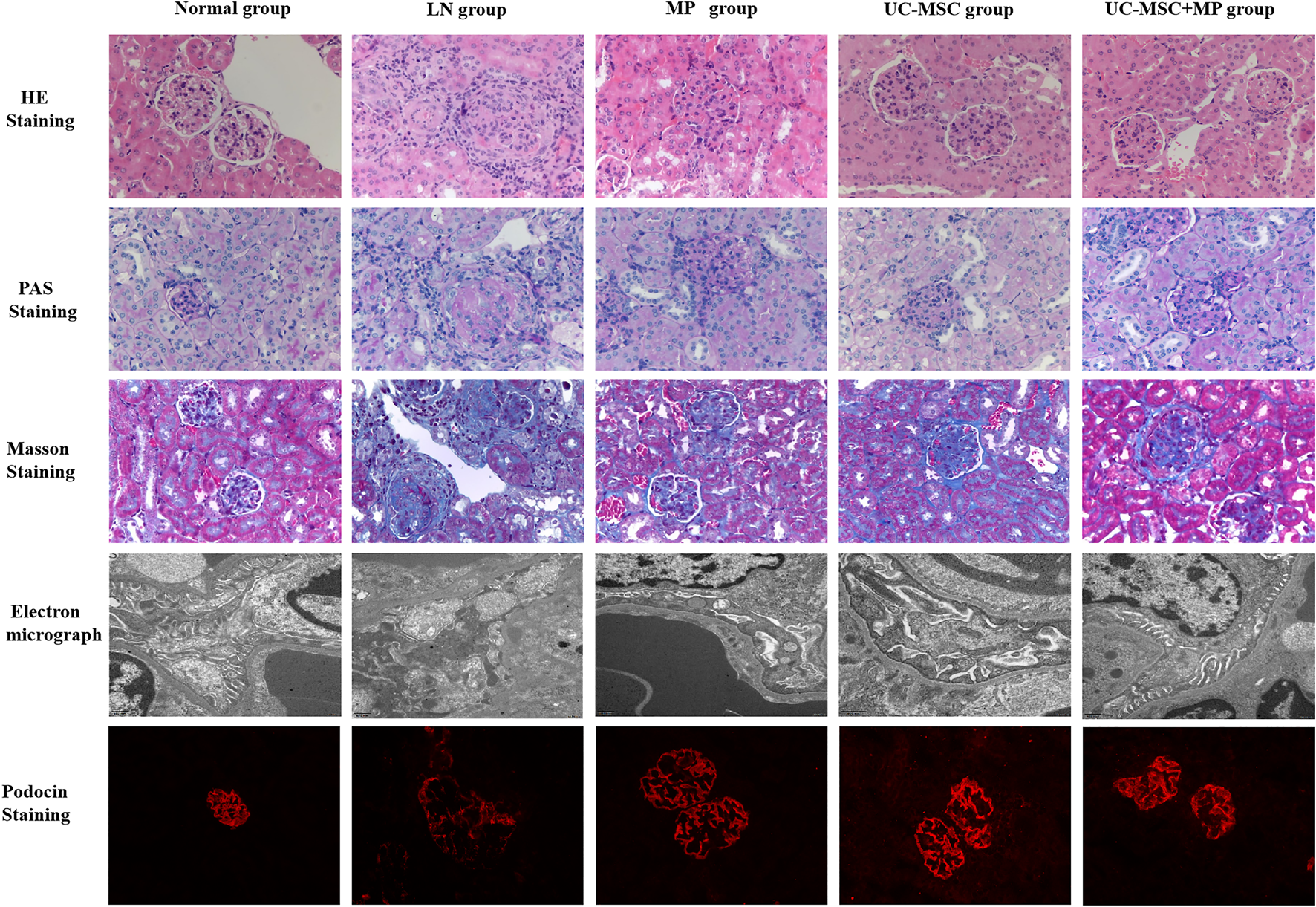 Pathological and electron microscopy results of the renal tissue. HE staining (first line, ×400), PAS staining (second line, ×400), Masson staining (third line, ×400), electron microscopy (fourth line), and podocin immunofluorescence staining (fifth line, ×400). Normal group (first column), LN group (second column), UC-MSC group (third column), MP group (fourth column), and UC-MSC + MP group (fifth column).
