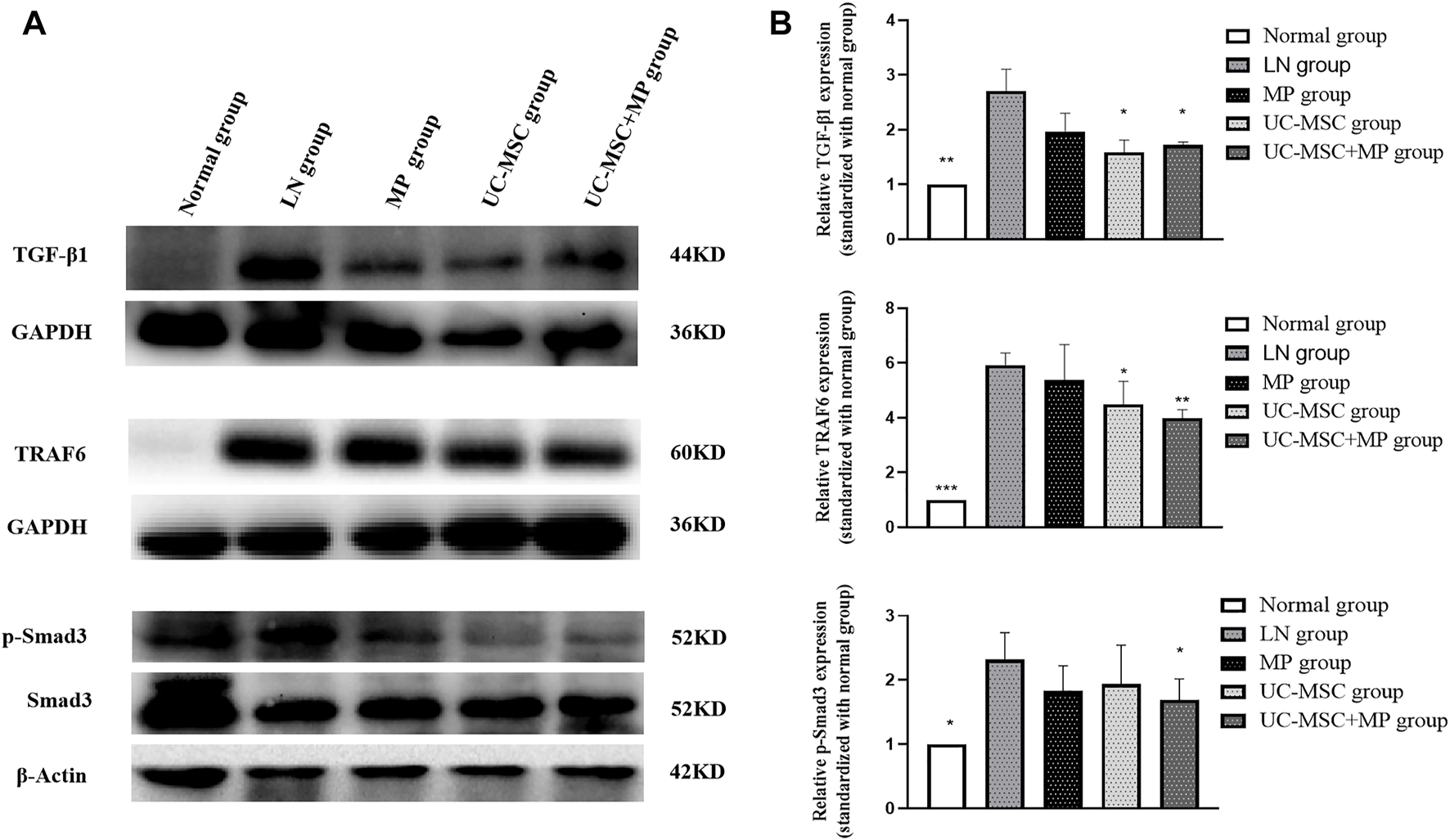Western blot examination showed significantly increased TGF-β1 expression in the of renal tissues of the LN group than that in the normal group (p < 0.05). Interestingly, UC-MSC and UC-MSC + MP groups showed significantly decreased TGF-β1 expression in the kidney than in the LN group (p < 0.05). Subsequently, the expression of p-Smad3 and TRAF6, which are the two key proteins of the TGF-β1 downstream pathway, was examined in the renal tissue. The results revealed that p-Smad3 and TRAF6 protein in the LN group were significantly increased compared with the normal group (p < 0.05). The downregulation of p-Smad3 and TRAF6 protein was observed after UC-MSC + MP treatment (p < 0.05), but only TRAF6 significantly decreased in the UC-MSC group (p < 0.05). Those findings suggest that the therapeutic mechanism of UC-MSC in LN mice may involve the inhibition of TGF-β1 (Figure 4).