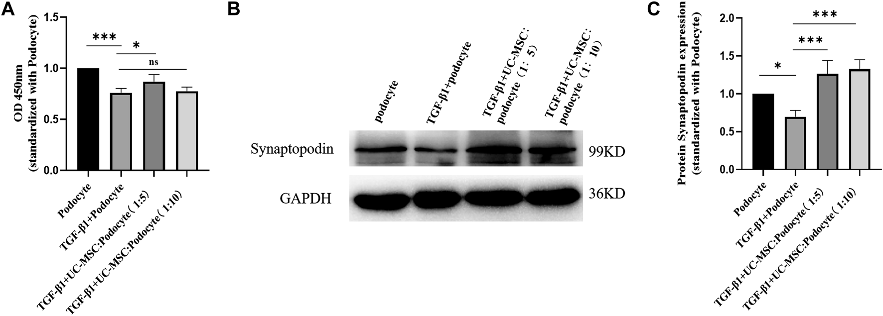 UC-MSC restored activity and synaptopodin expression in podocytes stimulated by TGF-β1. (A) Comparison of the podocyte activity. (B) Western blot results of synaptopodin. (C) Comparison of synaptopodin protein expression. ns: no significance; *p < 0.05; **p < 0.01; ***p < 0.001.