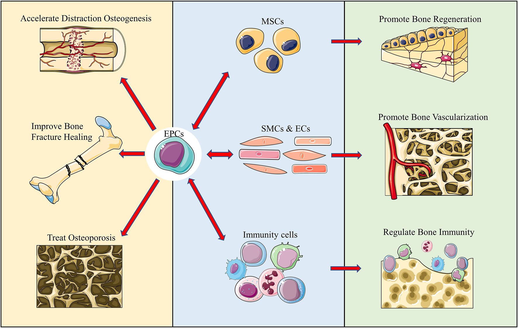 Graphical abstract. We reviewed and summarized the complex interactions of EPCs with multiple cells in bone regeneration, vascularization, and immunity. Additionally, we summarized the application of EPCs in various disease models and believe that it offers certain directions for future studies.
