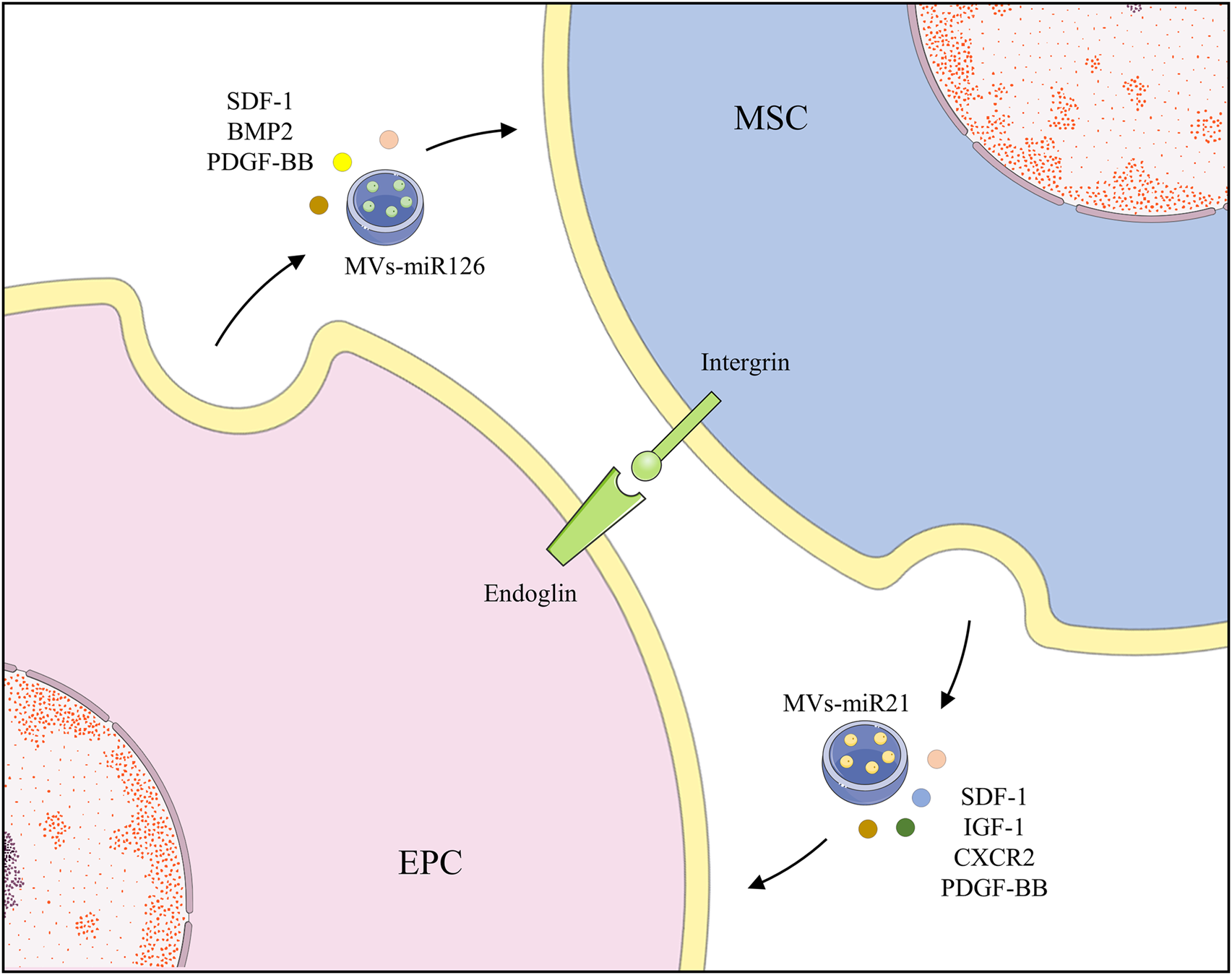 EPCs and MSCs recognize and bind to each other through endoglin and secrete various growth factors and EVs to promote functions of each other.