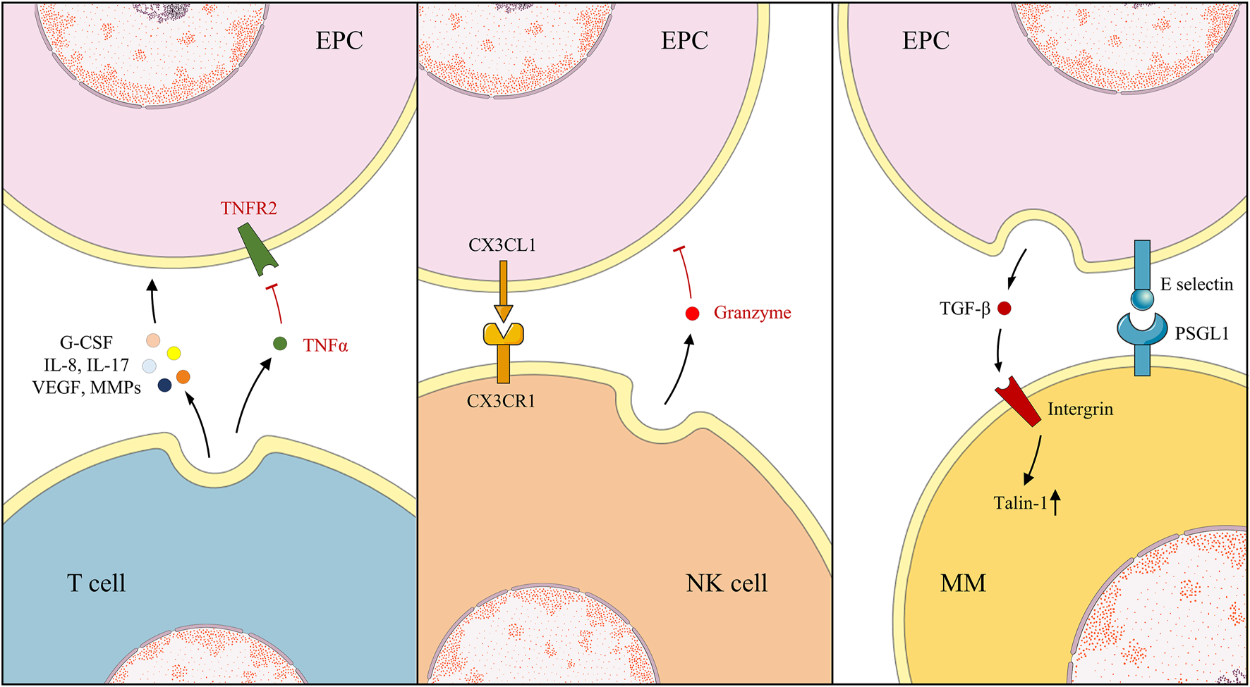 Under different environments, EPCs, T cells, NK cells, and MMs exhibit various action and reaction modes.