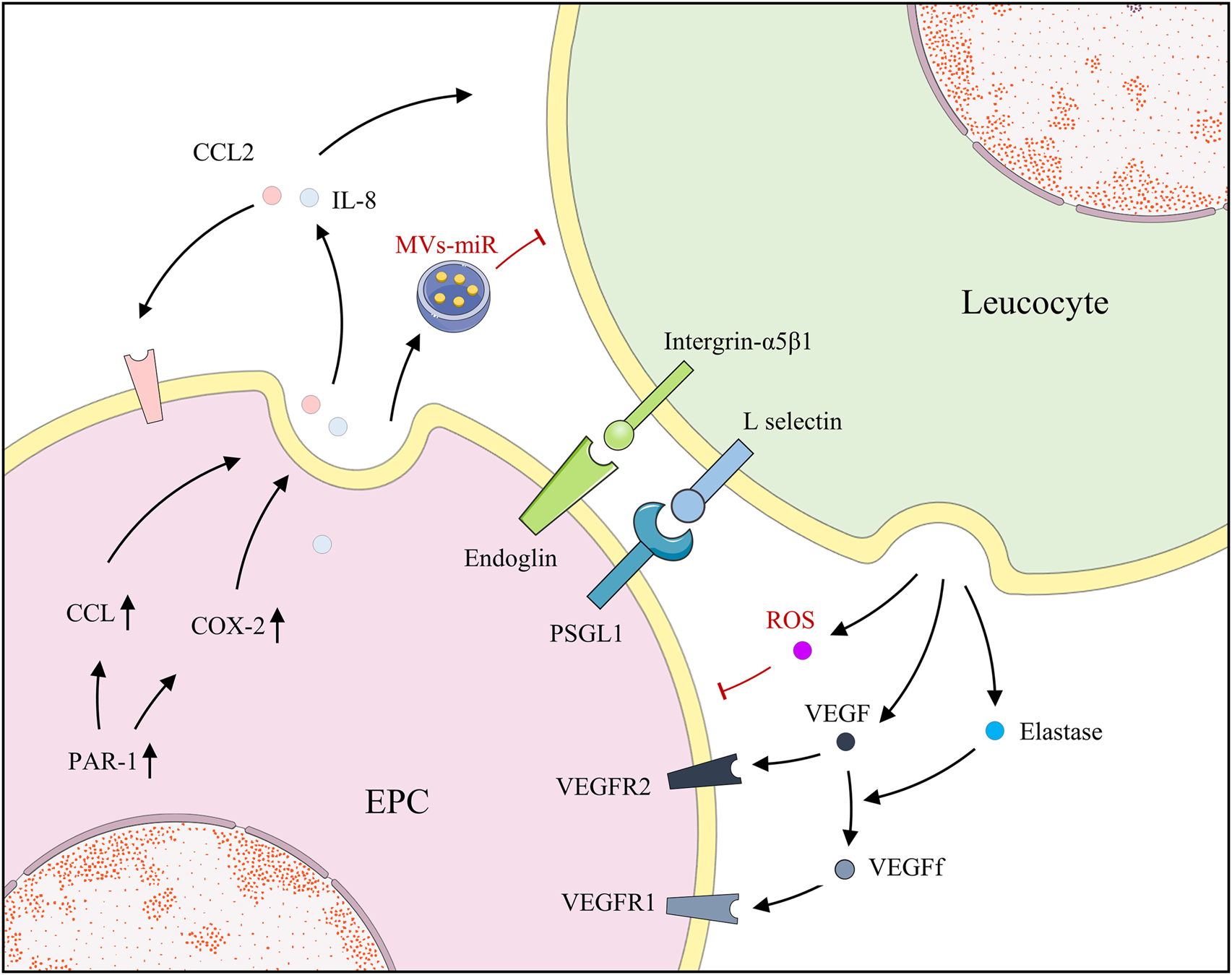 EPCs and leucocytes positively regulate each other by secreting factors; however, EPCs and leucocytes also secrete MVs and ROS, respectively, for negative regulation.