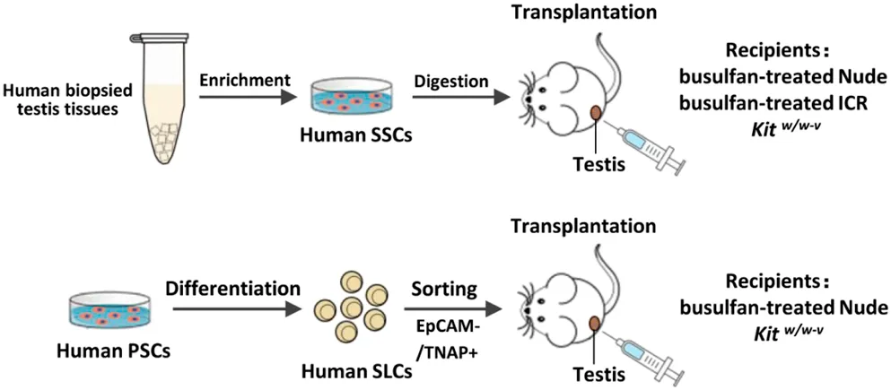 In this study, we assessed the engraftment of human spermatogonia derived from different sources in immune-competent and immunocompromised mouse recipients. In addition, by using the xenotransplantation models, we examined the cell identity of EpCAM-/TNAP+ SLCs differentiated from human PSCs. We further demonstrated that xenotransplantation with Kitw/w-v genetically infertile mice as recipients provided a convenient model to functionally evaluate human spermatogonial property in vivo.