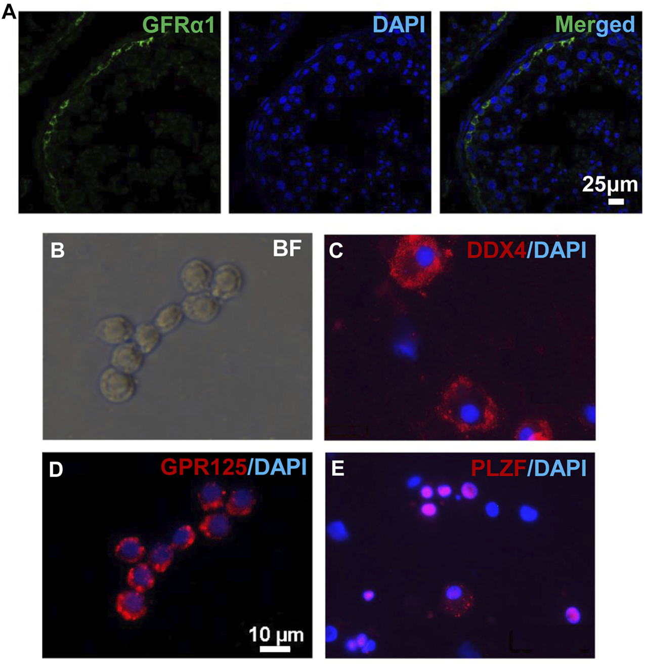 Human germ cells were collected from biopsied testes. (A) IHF was performed on biopsied testes from OA patients with a GFRα1 antibody. (B–E) Isolated human spermatogonia were observed in bright field (B), and detected by IF with antibodies against DDX4 (C), GPR125 (D), and PLZF (E), counterstained with DAPI. Scale bar: 10 μm (B,D) cells were cultured on a cover glass. (C,E) cells were spun onto slides by cytospin preparation.