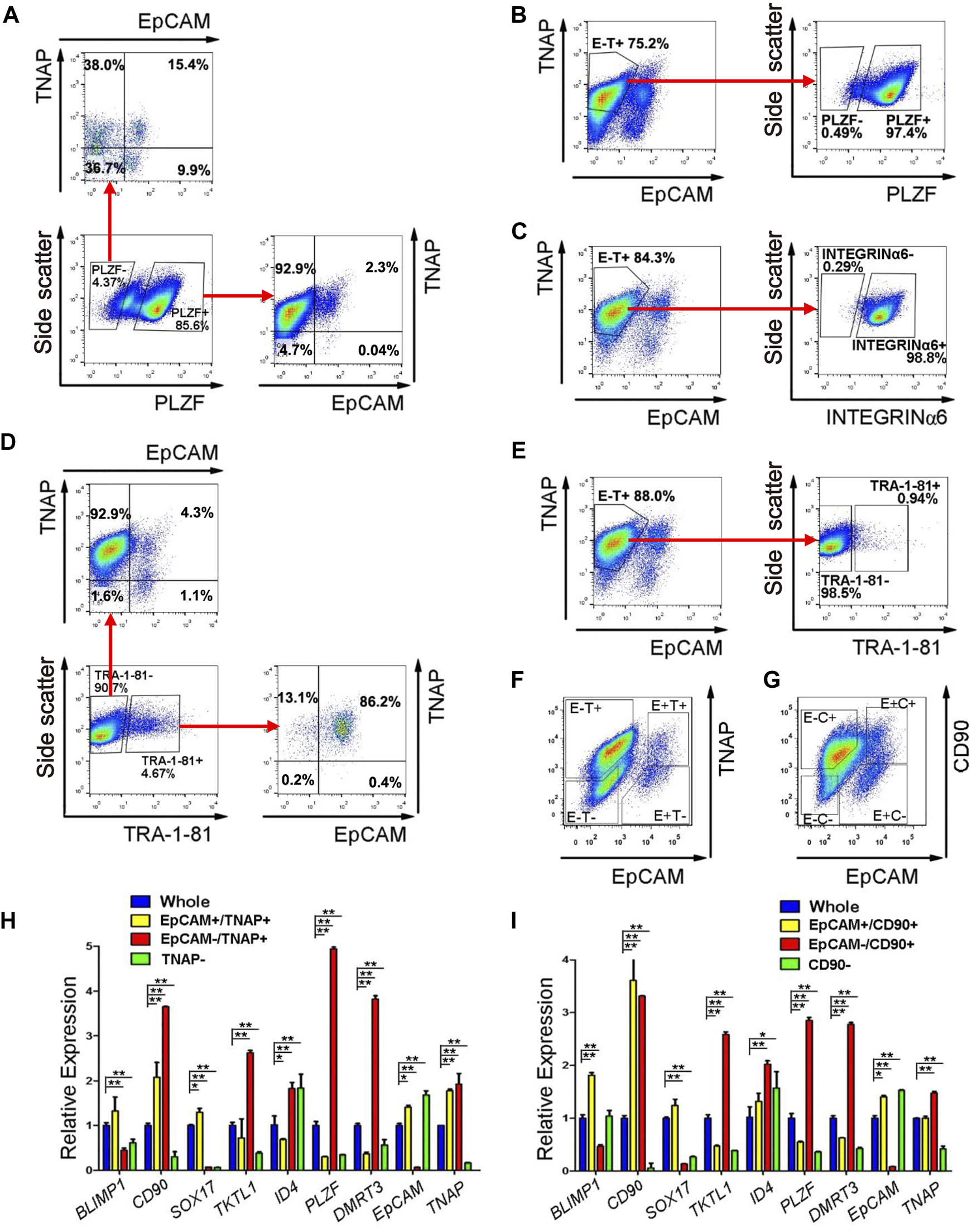 EpCAM-/TNAP+ population is enriched with SLCs differentiated from human PSCs. (A) Flow cytometry analyses of EpCAM and TNAP expression in PLZF positive and negative populations from PSCs. (B,C,E) Percentage of PLZF (B), INTEGRINα6 (C), and TRA-1-81 (E) in EpCAM-/TNAP+ population differentiated from human PSCs, analyzed by flow cytometry. (D) Flow cytometry analyses of EpCAM and TNAP expression in TRA-1-81 positive and negative populations from PSCs. (F–G) Fluorescence-activated cell sorting was conducted, using EpCAM and TNAP combination (F), or with EpCAM and CD90 antibodies (G). E, EpCAM; T: TNAP; C: CD90 (H–I) Real-time RT-PCR analyses of germ cell-specific genes on populations sorted with EpCAM and TNAP (H) or with EpCAM and CD90 staining (I). Data represent as the mean ± SEM (n ≥ 3). *: p < 0.05; **: p < 0.01. Negative gating controls were shown in Supplementary Figure S5.