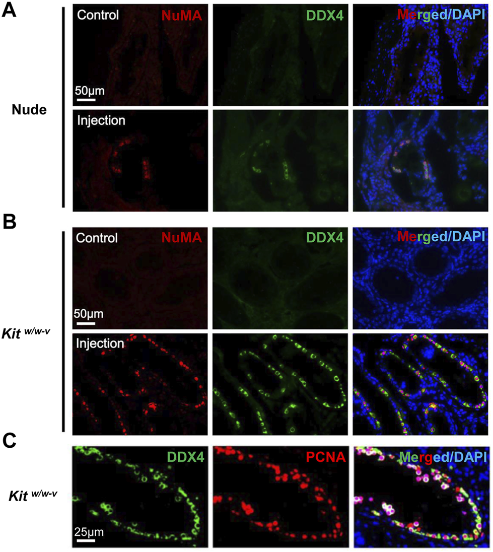 Human SLCs from PSCs readily colonize both nude and Kitw/w-v mouse testes. (A,B) IHF assays were performed 6 weeks post-transplantation on testes from nude mice and Kitw/w-v recipients with antibodies against NuMA and DDX4, counterstained with DAPI. (C) IHF assays on testes from Kitw/w-v mice with antibodies against PCNA and DDX4, counterstained with DAPI. Nude mice at age 6 weeks were injected intraperitoneally with 40 mg/kg busulfan and were subsequently used as recipients after 6 weeks. Male Kitw/w-v mice at 12-week old were used as recipients. About ∼100,000 EpCAM-/TNAP+ SLCs were injected per testis for xenotransplantation. The contralateral testis in the same mouse with mock PBS injection was used as a control. In total, 4 nude mice and 6 Kitw/w-v mice were injected.