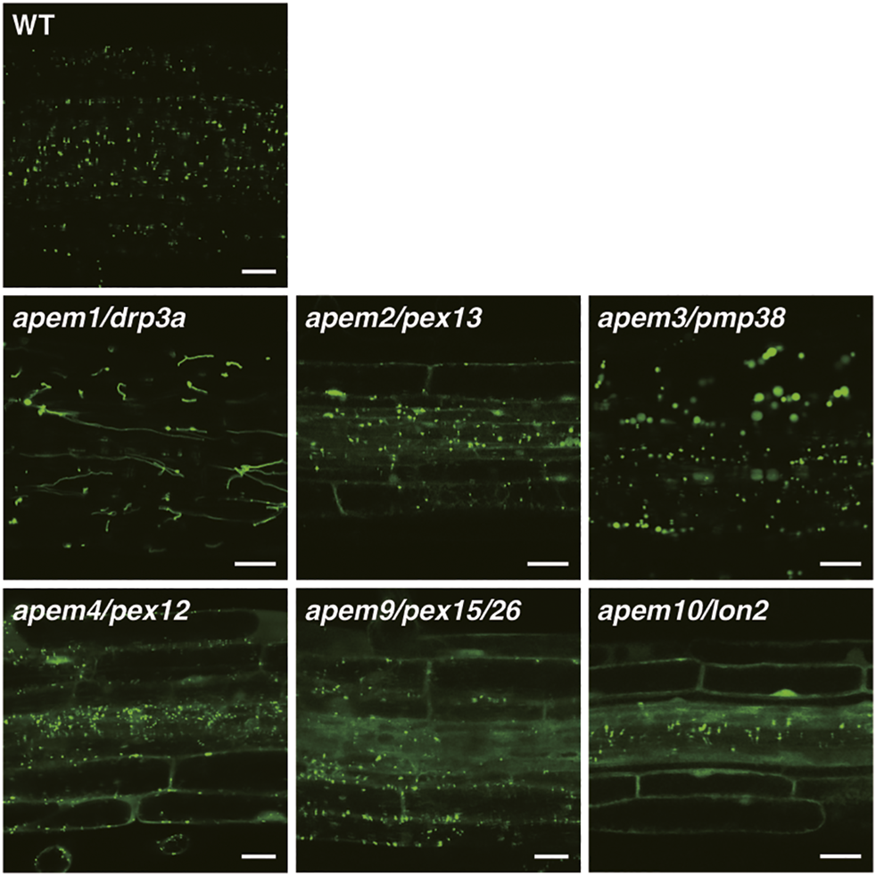 FIGURE 2. GFP fluorescence in root tissue of the WT plant and apem mutants expressing the peroxisome marker GFP-PTS1 (Mano et al., 2004; Mano et al., 2006; Goto et al., 2011; Goto-Yamada et al., 2014a). Bars, 20 µm.