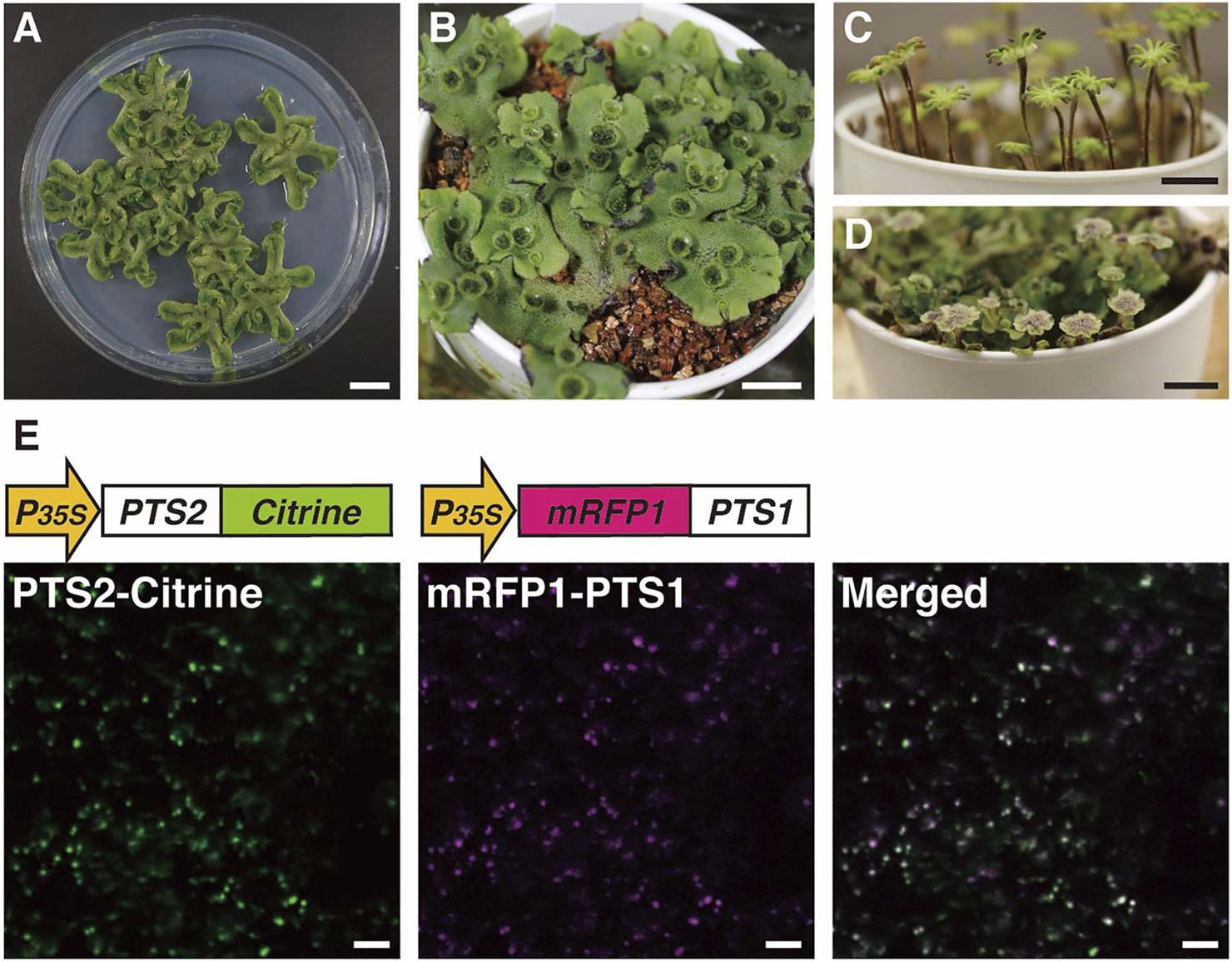 FIGURE 5. Images of M. polymorpha and visualization of peroxisomes using Citrine- and mRFP1-fused proteins. Vegetative haploid life form (thallus) on agar plate (A) and vermiculite (B) (Shimamura, 2016). Female (C) and male (D) sexual organs from the haploid thallus of a female plant or a male plant, respectively (Chiyoda et al., 2008; Inoue et al., 2019). Bars, 1 cm. (E) Fluorescence in peroxisomes was observed in thallus epidermal cells expressing both pro35S:PTS2-Citrine and pro35S:mRFP1-PTS1 genes (Mano et al., 2018). Bars, 10 μm.