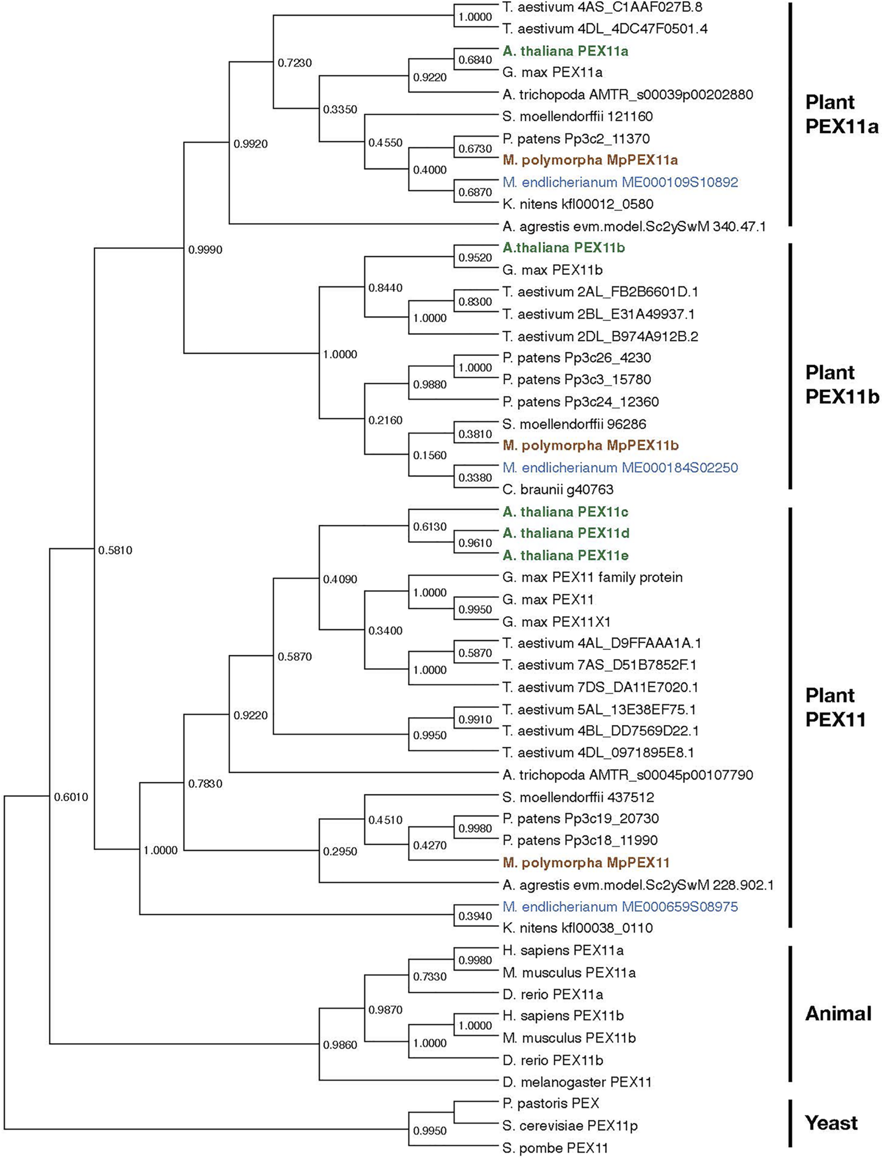 Peroxisome biogenesis requires a set of specialized proteins, peroxins, encoded by PEX genes. A. thaliana has 22 PEX genes (Table 2; Cross et al., 2016), while M. polymorpha has 18. Most PEX genes, except for PEX3, PEX11c/d/e, and PEX19, in A. thaliana have a single counterpart in M. polymorpha. Duplication and triplication of PEX3/PEX19 and PEX11, respectively, in A. thaliana explains why there are more PEX genes than in M. polymorpha. Phylogenetic analysis revealed that duplication of PEX11a and PEX11b predates the divergence of Zygnematales and Embryophytes, and the divergence of PEX11a/b and PEX11c/d/e likely occurred even earlier (Figure 6), suggesting that PEX11 should be further categorized into three subclasses, PEX11a, PEX11b, and others, increasing the total number of PEX subclasses in land plants to 18. It should be noted that M. polymorpha has the complete set of 18 PEX genes without duplication, which makes it suitable for functional and evolutionary analyses. The set of PEX genes in M. polymorpha appears to have been already established in the common ancestor of Zygnematales and Embryophytes, although there are a few missing genes in Mesotaenium endlicherianum and Klebsormidium nitens, which could be explained by secondary loss in these lineages and/or the presence of sequence gaps (Table 2).