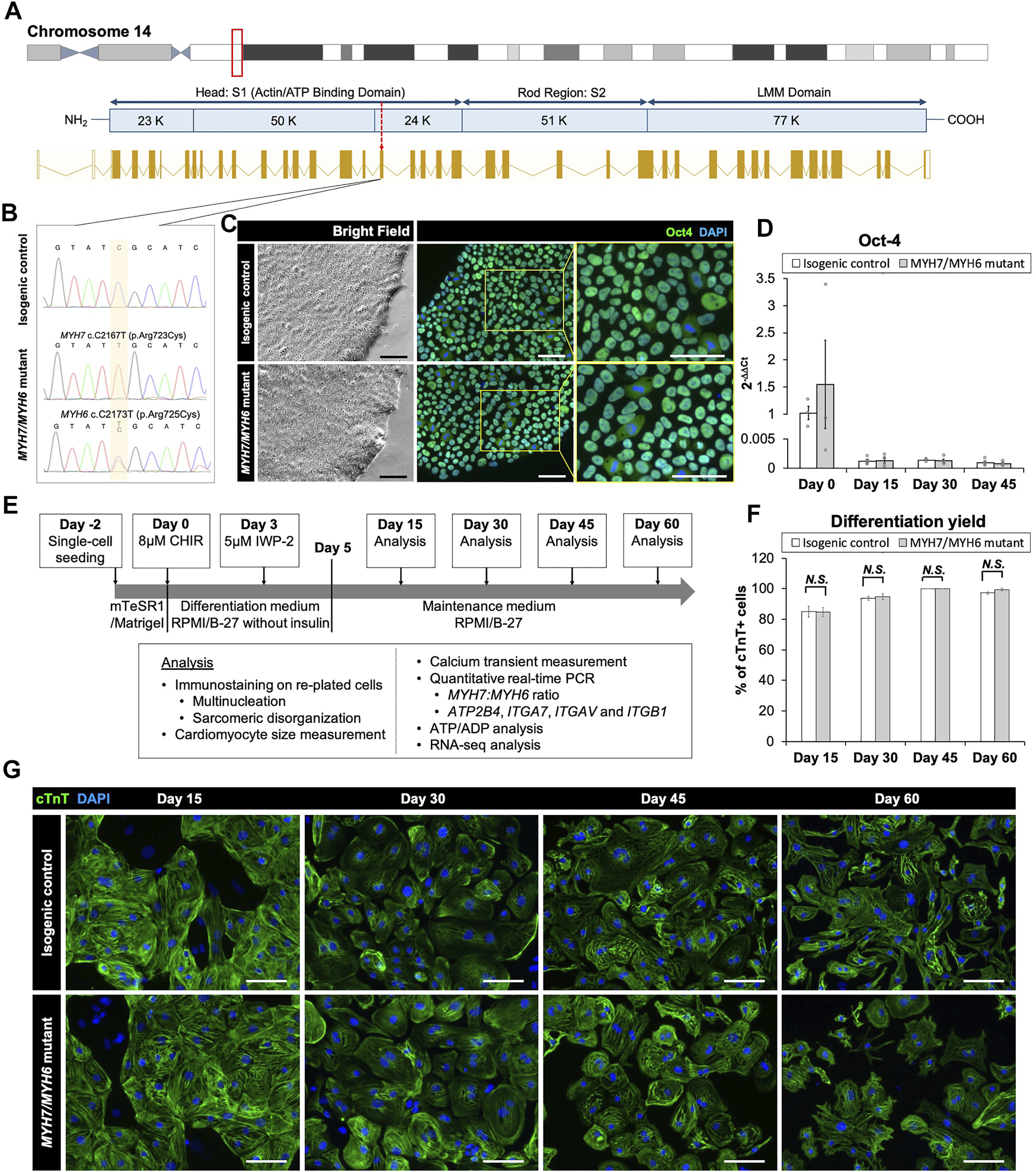 Base editing and characterization of the MYH7/MYH6 mutant hiPSCs. (A) Schematic of MYH7 locus as shown in the red box on chromosome 14 and c.2167 location as pointed by the red arrow for base editing. (B) Chromatogram of MYH7 mutant locus in hiPSCs showing c.C2167T (p.Arg723Cys, p.R723C) mutation and its isogenic parental genotype. (C) Bright field images and immunostaining of Oct-4 using the isogenic control and MYH7/MYH6 mutant hiPSCs. DAPI labels the nuclei (blue). (D) qPCR analysis for Oct-4 expression level using RNA isolated from the isogenic control and MYH7/MYH6 mutant hiPSCs. (E) Cardiac differentiation timeline and analysis regime. (F) Quantitative analysis of the differentiation efficiency based on the cTnT staining in the control and MYH7/MYH6 mutant cardiomyocytes. Note that mutation did not result in any significant difference in the cardiomyocyte differentiation efficiency. (G) Cardiac Troponin T (cTnT) and DAPI-stained hiPSC-CMs on Day 15, 30, 45, and 60 after the start of differentiation. Data represents mean ± SEM. (Scale Bar = 100 μm) (N.S.: not significant; Student t test).