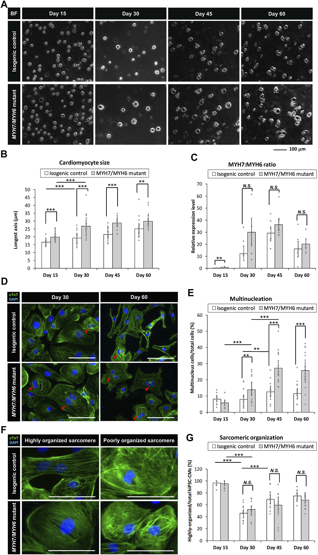 MYH7/MYH6 mutation recapitulates the hypertrophic cardiomyopathy phenotype in the hiPSC-CMs. (A,B) Bright-field images (A) and quantification (longest axis) (B) of the re-plated control and mutant cardiomyocytes prior to their attachment to the substrate to analyze their size at Day 15–60 of differentiation. Notice the hypertrophy of the mutant cells from Day 15–60. (Scale Bar = 100 μm). Data represents mean ± SEM. (**p < 0.01; ***p < 0.005; Student t test; n = 24 for six randomly picked particles with round and intact boundary from four bright field images per condition) (C)MYH7:MYH6 ratio obtained from qPCR analysis. Data represents mean ± SEM. (**p < 0.01; N.S.: not significant; Student t test; three wells for each condition and two experimental replicates for Day 15, Day 30, and Day 60, three experimental replicates for Day 45; n = 6 for Day 15, Day 30, and Day 60, respectively, and n = 9 for Day 45 conditions) (D) Representative images of cTnT-immunostained and DAPI-stained hiPSC-CMs to visualize nucleation in the differentiated cardiomyocytes using the isogenic control and MYH7/MYH6 mutant lines. Red arrows indicate multi-nucleated cells. Left images show Day 30 re-plated hiPSC-CMs and Right images show Day 60 re-plated hiPSC-CMs. (Scale Bar = 100 μm). (E) Bar graph shows that quantification of the percentage of hiPSC-CMs with more than one nucleus. Note significant increase in the multinucleated cells in the mutant conditions relative to control cells. Data represents mean ± SEM. (**p < 0.01; ***p < 0.005; Student t test; n = 9 immunostained images for Day 15 conditions, n = 18 immunostained images for Day 30, Day 45, and Day 60, respectively). (F) High magnification fluorescence images of cTnT and DAPI-stained hiPSC-CMs to analyze the sarcomeric organization in the control and R723C mutant cardiomyocytes. (Scale Bar = 50 μm). (G) Bar graph shows percentage of hiPSC-CMs with highly organized sarcomere. Data represents mean ± SEM. (***p < 0.005; N.S.: not significant; Student t test; n = 9 immunostained images for Day 15 conditions, n = 18 immunostained images for Day 30, Day 45, and Day 60, respectively).