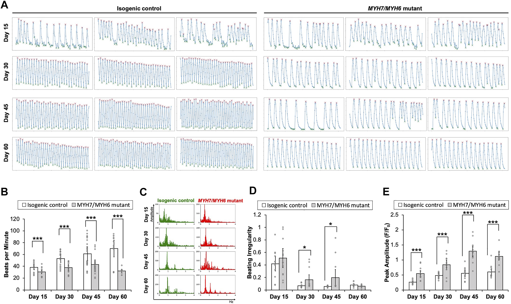 Functional assessment of the MYH7/MYH6 mutant cardiomyocytes. (A) Calcium transient trends for isogenic control and MYH7/MYH6 mutant hiPSC-CMs at Day 15–60 of differentiation. (B) Beat rate measured from calcium transient analysis using the isogenic control and MYH7/MYH6 mutant cardiomyocytes at Day 15–60 of differentiation. Note the significant reduction in beats per minute in the mutant cardiomyocytes relative to control. Data represents mean ± SEM; ***p < 0.005; Student t test; three wells of differentiated cardiomyocytes and four videos from separated locations in each well, and n = 12 for each condition. (C) Beat rate in frequency domain for both isogenic control and MYH7/MYH6 mutant cardiomyocytes at Day 15–60 of differentiation. (D) Quantitative result for irregular beating in the isogenic control and MYH7/MYH6 mutant cardiomyocytes at Day 15–60 of differentiation. The level of beating irregularity was defined as the average standard deviation for all beat intervals over twelve calcium transient measurements for each cell line at each time point. Data represents mean ± SEM; *p < 0.05; Student t test; three wells of differentiated cardiomyocytes and four videos from separated locations in each well, and n = 12 for each condition. (E) Peak amplitude of calcium signal measured from calcium transient analysis. Data represents mean ± SEM; ***p < 0.005; Student t test; three wells of differentiated cardiomyocytes and four videos from separated locations in each well, and n = 12 for each condition.