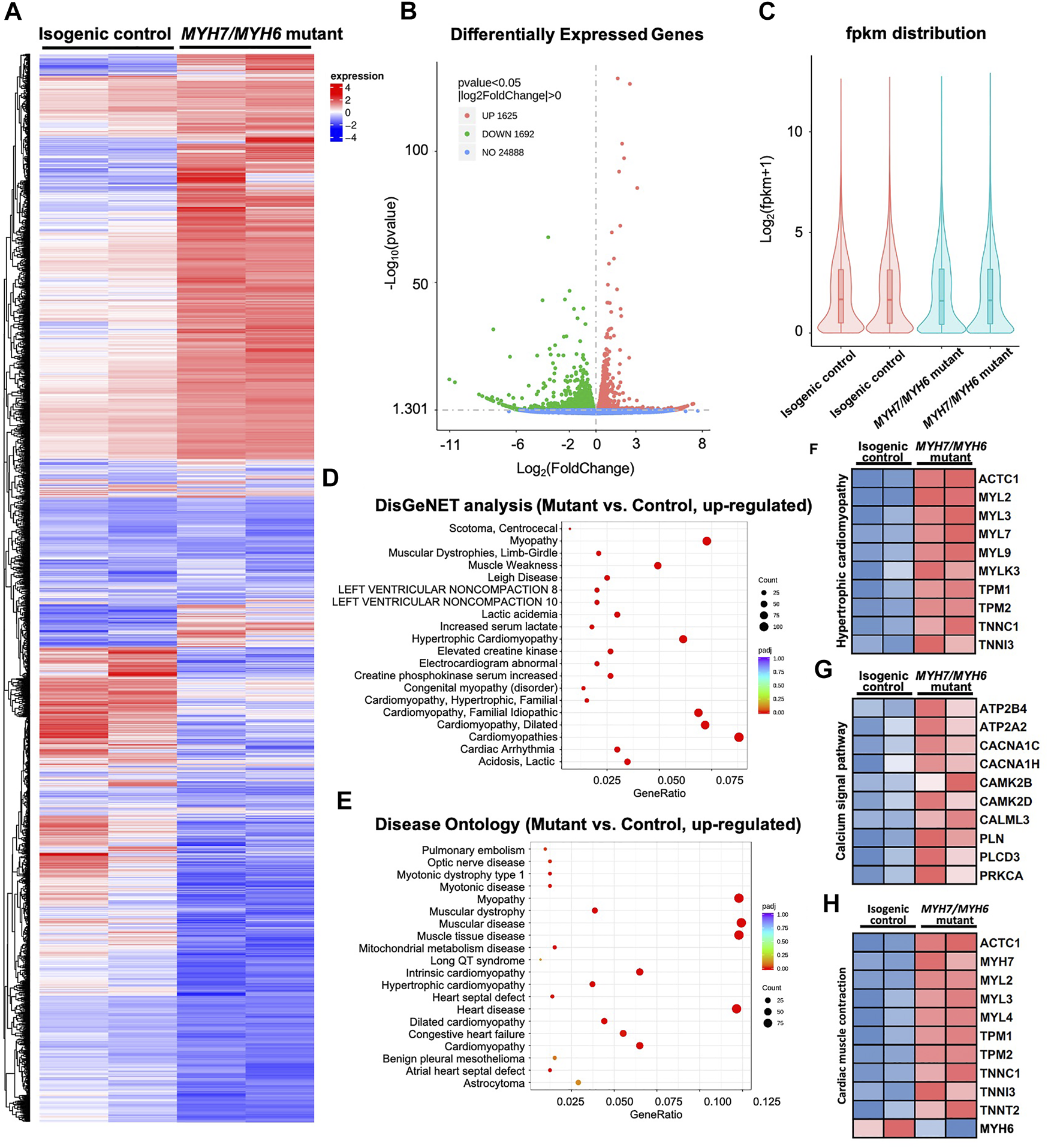 Bulk RNAseq analysis of MYH7/MYH6 dual mutation-induced hypertrophic cardiomyopathy in Day 15 hiPSC-CMs to evaluate the molecular mechanism. (A) Heatmap for comparing HCM mutant and control hiPSC-CMs showing the dysregulated transcripts in the mutant cardiomyocytes relative to control. (B) Volcano plot showed a total of 3,317 differentially expressed genes (DEGs) with the mutation. (p < 0.05, |log2fold change| > 0) (C) fpkm distribution showing similar log counts between the control and mutant lines. (D) Top 20 upregulated gene-disease associations by DisGeNet analysis. (E) Top 20 upregulated diseases annotated by disease ontology (DO) analysis. Size of the dot indicate the number of gene associated with the given disease and red color indicate the significance of this association. (F) Heatmap for 10 up-regulated DEGs that associated with hypertrophic cardiomyopathy. (G) Heatmap for 10 up-regulated DEGs that associated with calcium signal pathway. (H) Heatmap for 10 up-regulated DEGs and 1 downregulated DEG associated with cardiac muscle contraction.