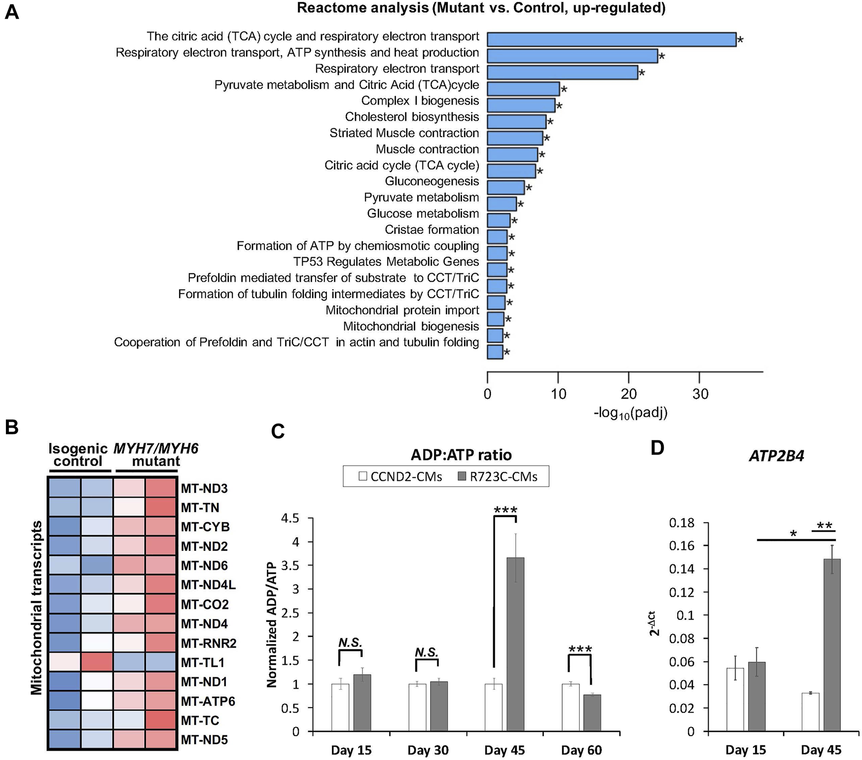 MYH7/MYH6 mutation results in dysregulation of the metabolic pathways and ADP/ATP dynamics. (A) Bar graph showing top 20 significantly altered metabolic pathways in the mutant cardiomyocytes relative to control cardiomyocytes; *p < 0.05. (B) Heatmap of the DEGs mitochondrial transcripts in the mutant cardiomyocytes relative to control cardiomyocytes. (C) ADP:ATP ratio using the lysate from control and mutant cardiomyocytes. Notice the sharp peak at Day 45 of differentiation in the mutant cells relative to control cells. Data represents mean ± SEM; ***p < 0.005; N.S.: not significant; Student t test; n = 3 wells of differentiated cardiomyocytes for each condition. (D) qPCR analysis for ATP2B4 transcripts using the RNA isolated from control and mutant cardiomyocytes at Day 15 and Day 45 of differentiation. Data represents mean ± SEM; *p < 0.05; **p < 0.01; Student t test; n = 9 cell lysate samples for Day 15 conditions, n = 7 cell lysate samples for Day 30 conditions, n = 10 cell lysate samples for Day 45 conditions, n = 6 cell lysate samples for Day 60 conditions.