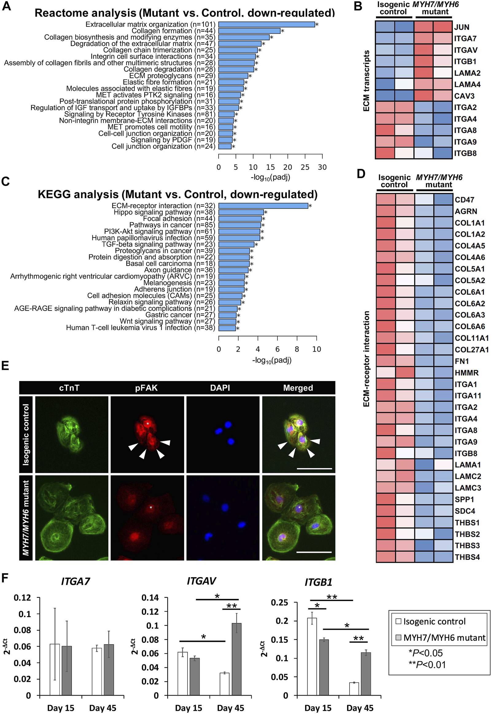 MYH7/MYH6 mutation drives altered ECM dynamics and ECM-receptor interaction. (A) Reactome analysis showing the top 20 annotated down-regulated pathways in the mutant as compared to control lines. Note that the most significantly dysregulated were the pathways associated with ECM organization. (B) Heatmap showing the dysregulated transcripts involving in ECM. (C) Top 20 annotated pathways determined by KEGG analysis with down-regulated DEG list. Note that ECM-receptor interaction transcripts were most significantly altered in the mutant cells relative to control cells. (D) Heatmap for up-regulated DEGs that associated with ECM-receptor interaction. (E) Representative images of cTnT and pFAK-immunostained hiPSC-CMs using isogenic control and mutant cells. White stars point out nucleus location and white arrows indicate activated FAK signal at the vicinity of the cell-substrate attachment site. DAPI labels the nuclei (blue). (Scale Bar = 100 μm) (F) qPCR analysis for ITGA7, ITGAV, and ITGB1 transcripts using RNA isolated from control and mutant cardiomyocytes at Day 15 and Day 45 of differentiation. Data represents mean ± SEM; *p < 0.05; **p < 0.01; Student t test; n = 4 cell lysate samples per condition.