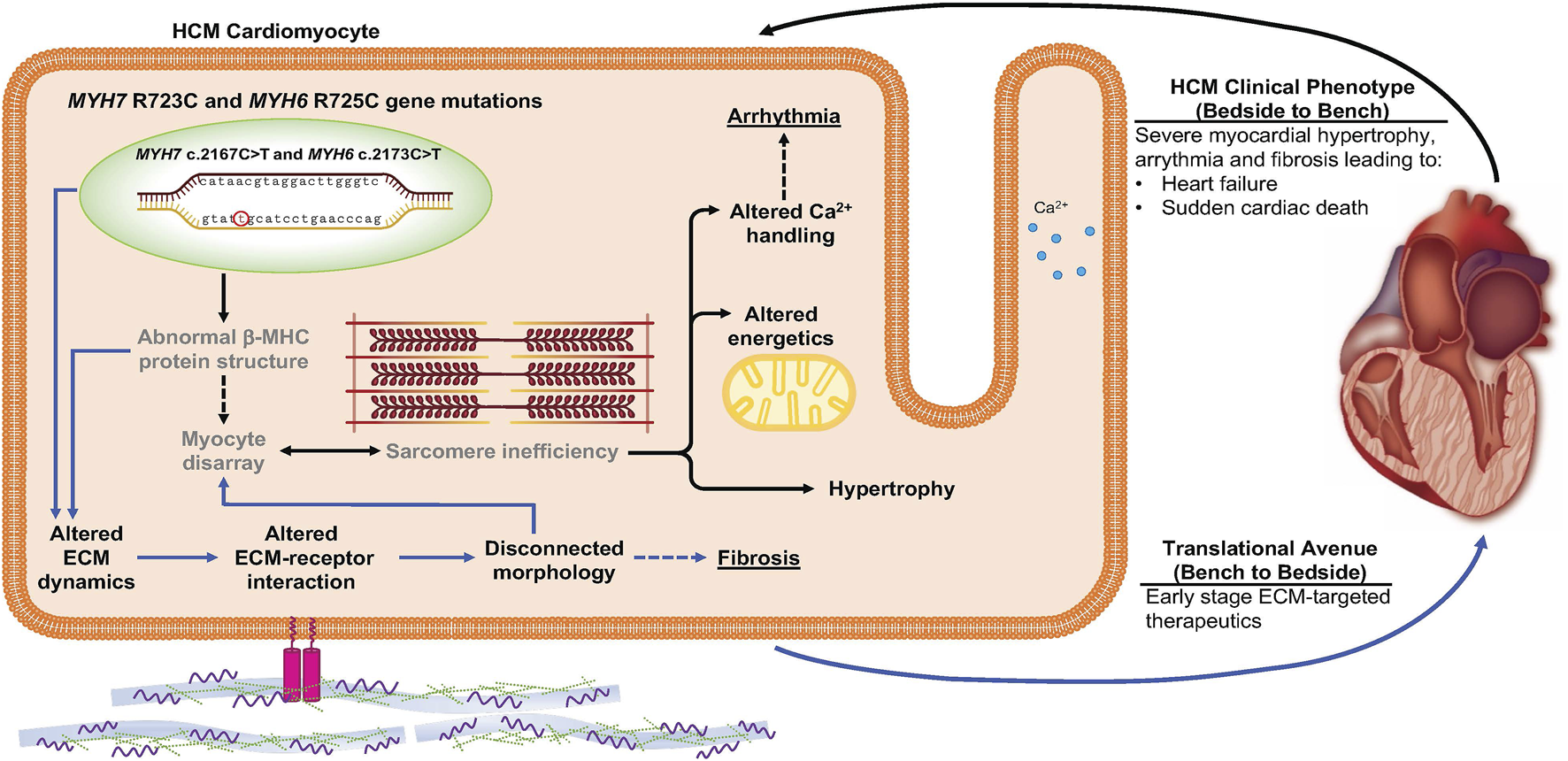Schematic depicting the impact of MYH7/MYH6 mutation in mediating hypertrophic cardiomyopathy. Our data indicate that MYH7/MYH6 mutation results in hypertrophy, dysregulation of metabolic as well as ECM dynamics. Solid black arrows and bold text represent HCM phenotypes that have been reported for other MYH7 mutations, grey text represents previously reported features of MYH7 mutations. Solid blue arrows represent the mutation associated ECM dynamics which is novel to the field and could provide targets to develop drug therapies potent in the early stages of HCM.