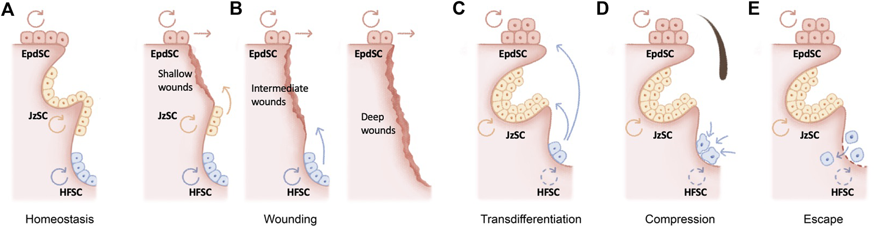 Molecular mechanisms underlying hair follicle miniaturization in aging (A) The hair follicle as a major skin appendage is maintained by hair follicle stem cells (HFSCs) residing in the bulge, an anatomic location beneath the sebaceous gland and isthmus of the pilosebaceous unit. HFSCs fuel the cyclic regeneration of hair follicles during homeostatic hair growth, whereas epidermal stem cells (EpdSC) and junctional zone stem cells (JzSCs) maintain the epidermis and junctional zone, respectively (B) HFSCs drive both follicular and epidermal regeneration during wound repair. Depending on the wounding depth, different populations of stem cells are induced to contribute to wound repair (C–E) Several cellular and molecular mechanisms have been recently proposed to explain the fate of aging HFSCs in murine models, including epidermal transdifferentiation (C), mechanical compression in situ(D), and escape into dermis (E).