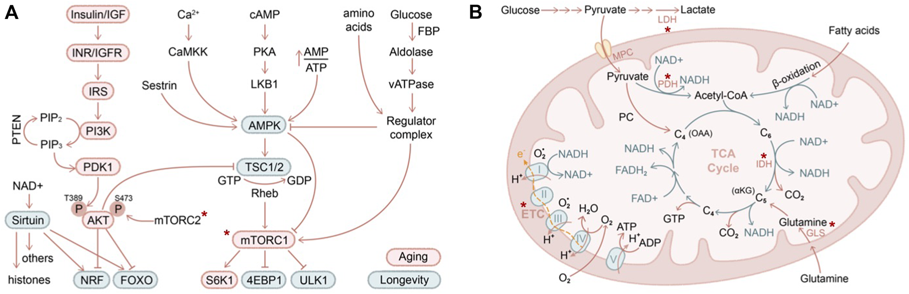Nutritional and metabolic regulation of skin aging (A) IIS (insulin/insulin-like growth factor) and AMPK/mTOR are two major pathways in regulating nutrients and metabolism that have been described in contributing to organismal aging (red circle) and longevity (green circle). Asterix indicates components of these pathways that have been demonstrated to contribute to skin aging (B) Mitochondrial biology is closely intertwined with aging biology. Highlighted in red are several key genes that have been shown to regulate skin stem cell aging in vivo. LDH, lactate dehydrogenase; PDH, pyruvate dehydrogenase; MPC, mitochondrial pyruvate carrier; GLS, glutaminase; IDH, isocitrate dehydrogenase (converting isocitrate into alpha-ketoglutarate). Asterix indicates components of these pathways that have been demonstrated to contribute to skin aging.