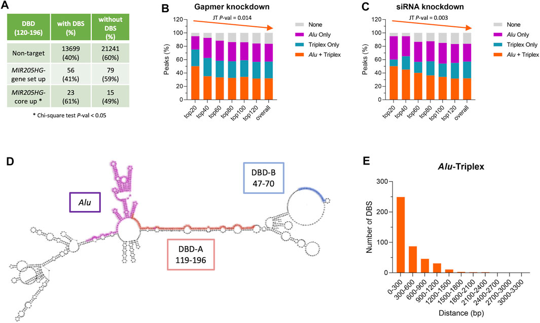FIGURE 4. The presence of Alu and triplex-forming regions is a feature of both MIR205HG and its target genes. (A) Table showing the number and percentage of genes predicted to form or not a triplex with MIR205HG in lists of non-target genes (“Non-target”), genes commonly up-modulated after MIR205HG knockdown using either a siRNA or a gapmer (“MIR205HG-gene set up”), and genes commonly upmodulated after MIR205HG knockdown and coherently downmodulated after MIR205HG overexpression (“MIR205HG-core up”). Gene lists are from Profumo et al. (2019). (B) Bar plot showing the percentage of genes having a DBS (i.e., a triplex) and/or Alu element among genes differentially expressed after MIR205HG knockdown using a gapmer antisense oligonucleotide. Significance of the monotone trend of triplex + Alu percentage in regulated genes ranked for fold-change (top20 genes have the highest fold-change) was assessed by Jonckheere-Terpstra (JT) test. (C) Bar plot showing the percentage of genes having a DBS (i.e., a triplex) and/or Alu elements among genes differentially expressed after MIR205HG knockdown using a siRNA. Significance of the monotone trend of triplex + Alu percentage in regulated genes ranked for fold-change (top20 genes have the highest fold-change) was assessed by Jonckheere-Terpstra (JT) test. (D) MIR205HG predicted secondary structure (as from RNAfold); DBD-A, DBD-B and Alu elements are highlighted in the structure. (E) Distance between the triplex (DBS) and the Alu element in MIR205HG proximal region peaks forming a triplex. Bar plots and the table were generated using GraphPad Prism and Microsoft Excel, respectively.