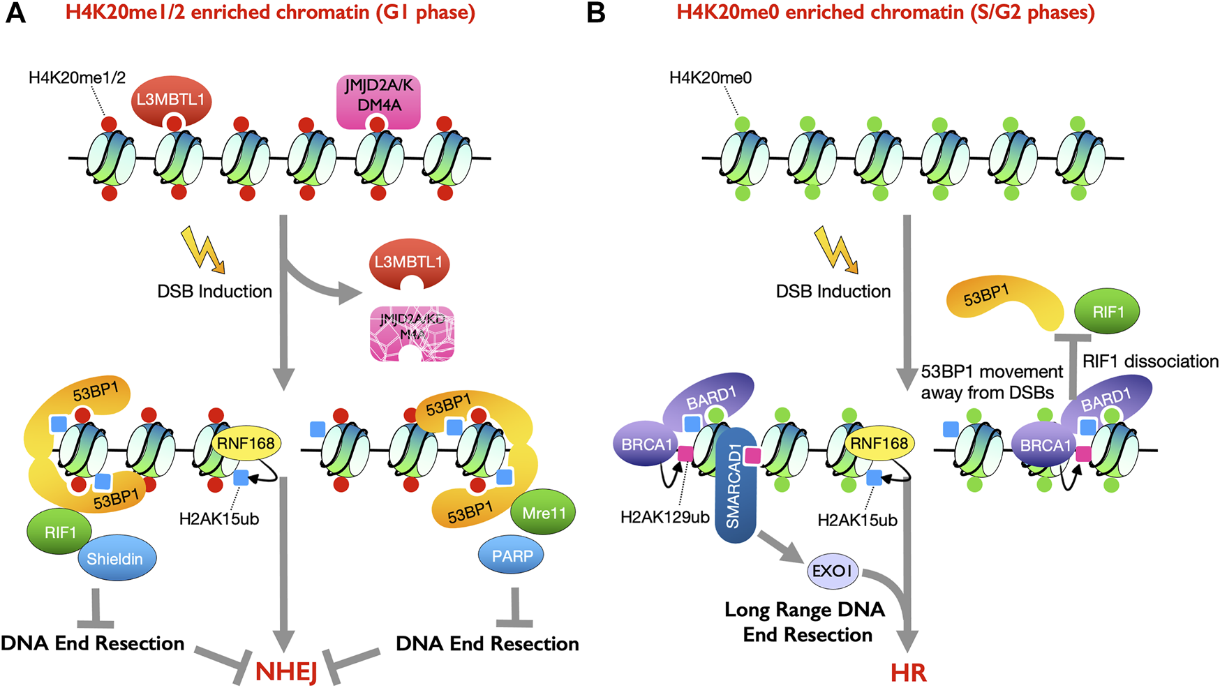 Histone modifications involved in dictating the cell cycle phase specific DSB repair pathway choice. (A) Histone mark H4K20me1/2 is enriched in G1 phase of the cell cycle. 53BP1 binds to nucleosomes containing both H4K20me1/2 and H2AK15ub, mediated by RNF168 upon DSB induction, to promote DSB repair by NHEJ (B) Unmethylated H4K20me0 is enriched in S/G2 phases of the cell cycle. BRCA1-BARD1 heterodimer recognizes H4K20me0 and H2AK15ub to facilitate HR repair (right). BRCA1 mediated H2AK129ub recruits SMARCAD1 to promote DNA end resection and thus HR (left).