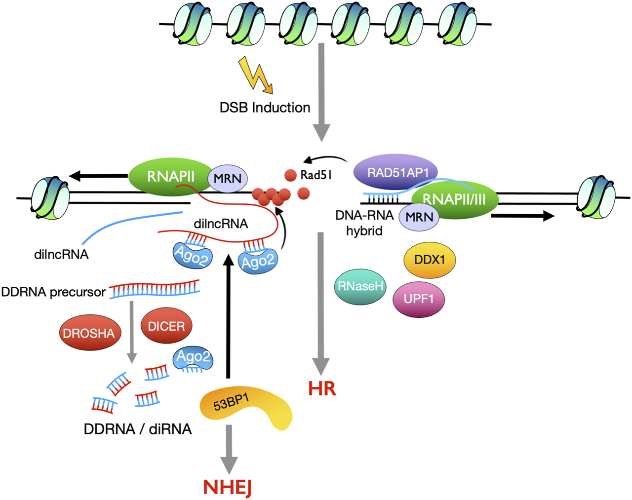 A growing body of evidence shows that local DSB induced non-coding transcripts play important roles in HR (Durut and Mittelsten Scheid, 2019; Ohsawa et al., 2013). Small RNAs derived from the vicinity of DSBs, named DSB-induced RNAs (diRNAs) or DICER- and DROSHA-dependent small RNAs (DDRNAs), have been identified in both plants and vertebrates (Francia et al., 2012; Wei et al., 2012). DiRNAs promote HR repair in a manner dependent on the effector protein Argonaute 2 (Ago2) that is required for RAD51 recruitment (Gao et al., 2014). The production of diRNAs/DDRNAs indicates activation of non-coding transcription surrounding DSBs. Indeed, RNA polymerase II (RNAPII) is recruited to DSB sites, via its binding to the MRN complex, and generates damage-induced long non-coding RNAs (dilncRNAs). Most of the dilncRNAs are transcribed in the direction away from the DSB while less are transcribed towards the DSB to generate, which act not only as precursors to DDRNAs but also scaffolds for DDRNAs recruitment to the dilncRNA-from molecules (Michelini et al., 2017) (Figure 3). On the other hand, dilncRNAs and DDRNAs facilitate DDR focus formation and interact with 53BP1 (Michelini et al., 2017), suggesting a role of DDRNAs in promoting NHEJ repair (Figure 3).