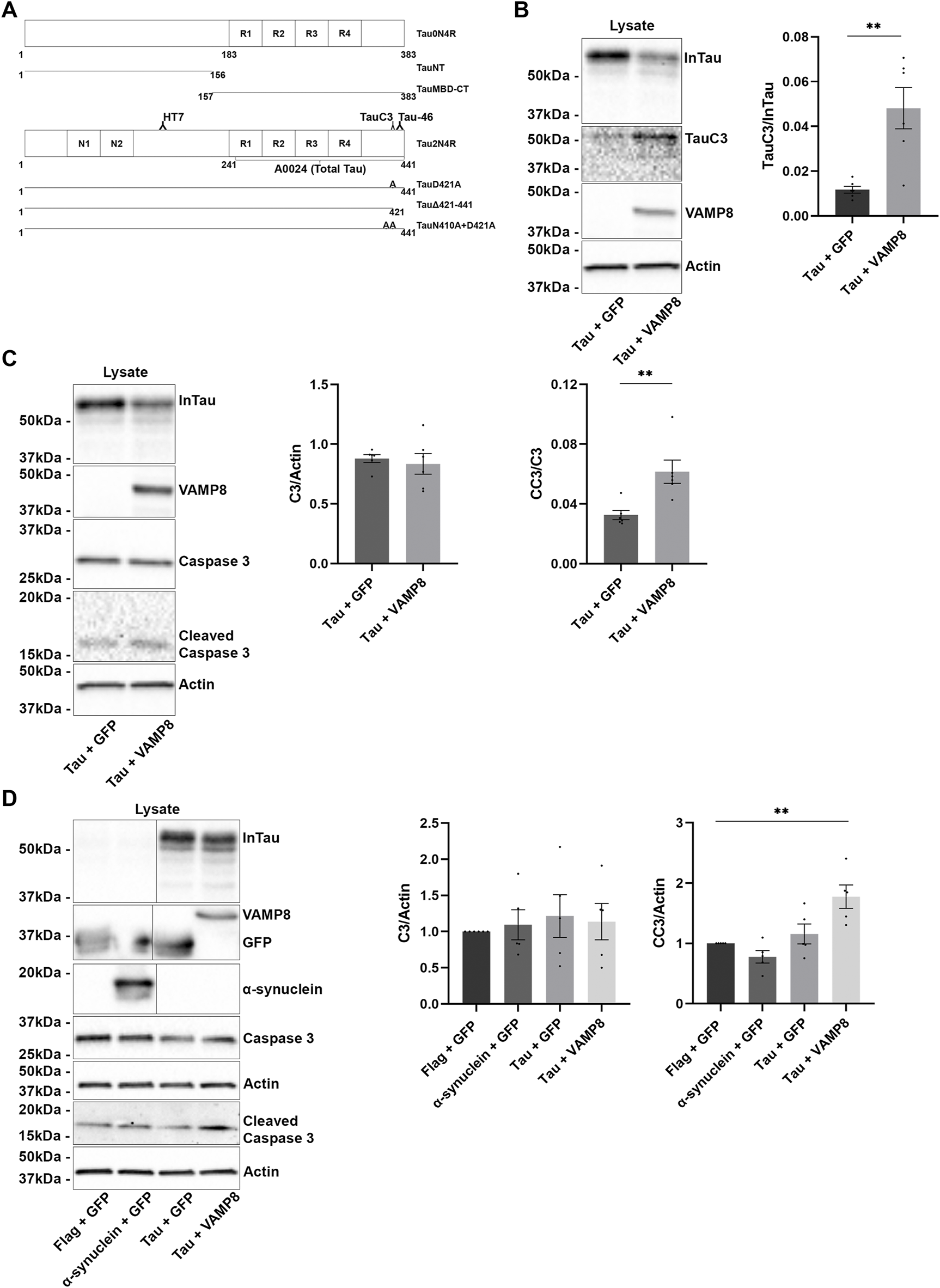 Overexpression of VAMP8 increases the cleavage of Tau by Caspase 3 and increases the amount of active caspase-3 in the cell lysate. For all the figures, GFP alone corresponds to GFP-empty vector. (A) Schematic representation of Tau constructs and Tau antibodies. All the experiments were carried out with 0N4R Tau isoform. The constructs TauNT and TauMBD-CT were produced from 0N4R. For the antibodies, the isoform 2N4R was used for consistency with the literature. For B and C, N2a cells were transfected either with Flag-Tau and GFP-empty or Flag-Tau and GFP-VAMP8 plasmids. (B) Representative Western blot with the anti-Tau antibody A0024 recognizing total intracellular Tau (InTau) and the antibody TauC3 directed against Tau cleaved by caspase-3 of the cell lysate revealing that the overexpression of VAMP8 decreased InTau but increased InTau cleaved by caspase-3 (TauC3). For the densitometry analysis of the TauC3/total Tau ratio, InTau (total Tau) was normalized with the actin signal, the loading reference. (C) Representative Western blot with the anti-Tau antibody A0024, the anti-caspase-3 antibody (C3) and the anti-cleaved caspase-3 antibody (CC3) of the cell lysate showing that the C3 signal is similar for cells overexpressing either Tau alone or Tau and VAMP8 while the co-expression of Tau and VAMP8 increased intracellular CC3. CC3/C3 ratio was analyzed by densitometry. n = 6. Data represent scatter plot and mean±SEM. **p < 0.01. (D) N2a cells were transfected either with Flag-empty and GFP-empty (Flag + GFP), α-synuclein and GFP-empty, Flag-Tau and GFP-empty, Flag-Tau and GFP-VAMP8 plasmids. Representative Western blot of the cell lysate revealed with the antibodies recognizing Tau (A0024), VAMP8, GFP, α-synuclein, caspase-3, cleaved caspase-3 and actin. No difference of total caspase-3 levels was noted between the experimental conditions. In the case of cleaved by caspase-3, the condition Tau and VAMP8 presented the highest levels. For the densitometry analysis of the signal of caspase-3 and cleaved caspase-3 was normalized with the actin signal, the loading reference. Black frames were used to mark the splice sites of immunoblot images. n = 5. Data represent scatter plot and mean±SEM. **p < 0.01.