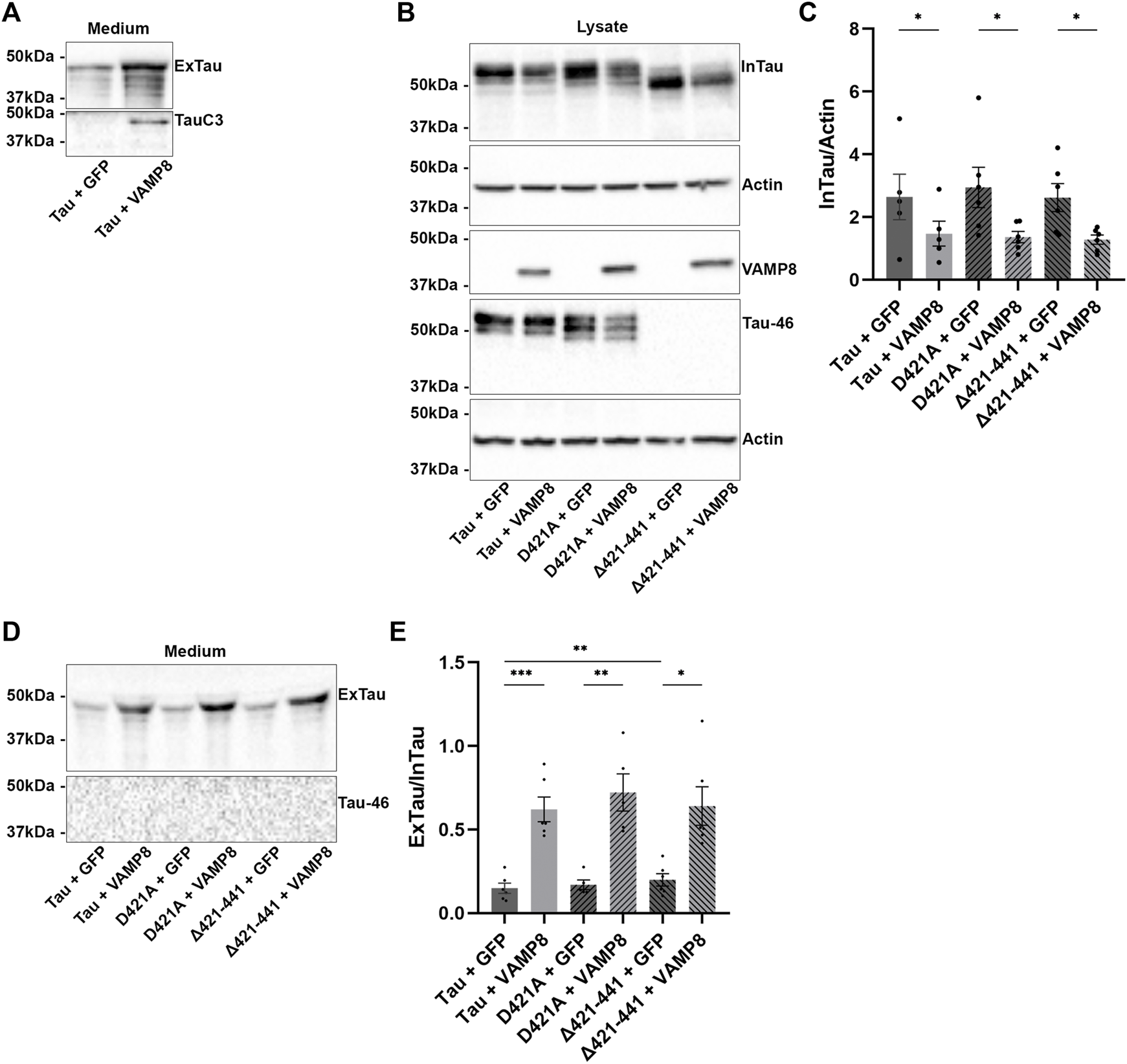 Secretion of Tau upon VAMP8 overexpression does not depend on the cleavage of Tau by caspase-3. N2a cells were transfected either with Flag-Tau and GFP-empty, Flag-Tau and GFP-VAMP8, TauD421A and GFP-empty, TauD421A and GFP-VAMP8, TauΔ421-441 and GFP-empty or TauΔ421-441 and GFP-VAMP8 plasmids for 48 h. (A) Representative Western blot with TauC3 antibody of the medium showing the detection of Tau cleaved by caspase-3 only detectable with VAMP8 overexpression. (B) Representative Western blot with A0024 of the cell lysate showing that the overexpression of VAMP8 decreased intracellular Tau (InTau) of all Tau mutants. (C) Densitometry analysis of A0024 signal of InTau. n = 6. Data represent scatter plot and mean±SEM. *p < 0.05. (D) Representative Western blot with A0024 of the medium showing that the overexpression of VAMP8 increased extracellular Tau (ExTau) of all Tau mutants. (E) Densitometry analysis of A0024 signal of the ExTau/InTau ratio. n = 6. Data represent scatter plot and mean±SEM. *p < 0.05, **p < 0.01, ***p < 0.001.