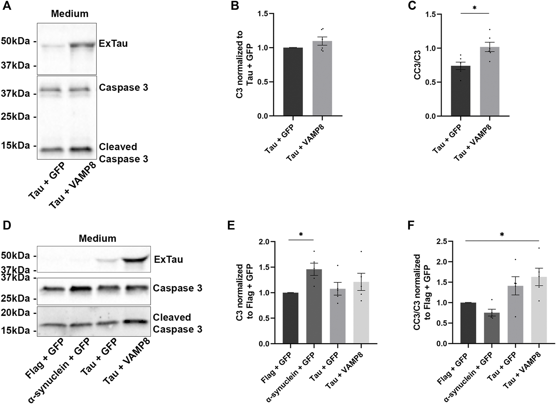 Increased secretion of active caspase-3 upon the overexpression of Tau and VAMP8. (A) N2a cells were transfected either with Flag-Tau and GFP-empty or Flag-Tau and GFP-VAMP8 plasmids for 48 h. Representative Western blot with A0024 for staining of extracellular Tau (ExTau), the antibody C3 for total caspase-3 and the antibody CC3 for cleaved caspase-3 of the medium revealing that the secretion of total caspase 3 was similar with Tau alone or Tau and VAMP8 overexpression and that cleaved caspase-3 was increased for Tau and VAMP8. (B,C) Densitometry analysis of C3 and CC3/C3 ratio in the medium. The signal of C3 and CC3 was normalized with that of Tau and GFP. n = 6. Data represent scatter plot and mean ± SEM. *p < 0.05. (D) N2a cells were co-transfected either with Flag-empty and GFP-empty, α-synuclein and GFP-empty, Flag-Tau and GFP-empty or Flag-Tau and GFP-VAMP8 plasmids. Representative Western blot of the medium to confirm the secretion of Tau, caspase-3 and cleaved caspase-3. (E,F) Densitometry analysis of C3 and CC3 signals normalized to that of Flag-empty + GFP-empty. The secretion of CC3 in the medium of Flag-tau and GFP-VAMP8 was significantly higher than that detected in Flag-empty + GFP-empty. N = 5. Data represent scatter plot and mean±SEM. *p < 0.05.