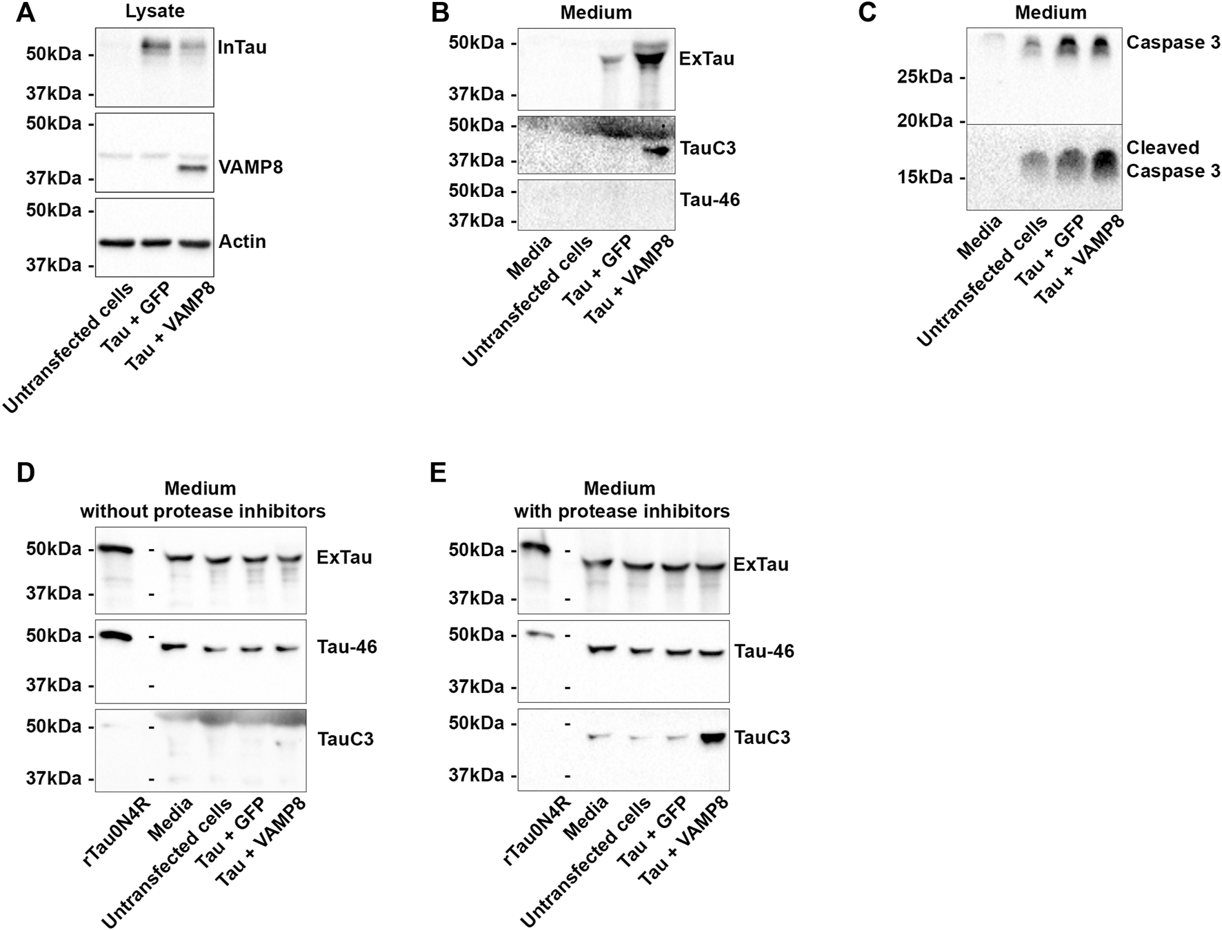 In the present study, we examined whether the increase of Tau secretion by VAMP8 affected its intra- and extracellular cleavage. Upon VAMP8 overexpression, an increase of Tau cleaved by caspase-3 in the cell lysate was observed. This increase was correlated to an increase of active caspase-3. Using a Tau mutant not cleavable by caspase-3, we demonstrated that Tau cleavage by caspase-3 was not necessary for its secretion upon VAMP8 overexpression. We also demonstrated that Tau cleavage by caspase-3 could occur extracellularly because of the secretion of active caspase-3 by cells overexpressing Tau and VAMP8. Our results also revealed that N410 affected the cleavage of Tau released upon VAMP8 overexpression. Lastly, we observed that the N-terminal of Tau regulated the secretion of a Tau fragment containing the microtubule-binding domain and C-terminal upon VAMP8 overexpression.