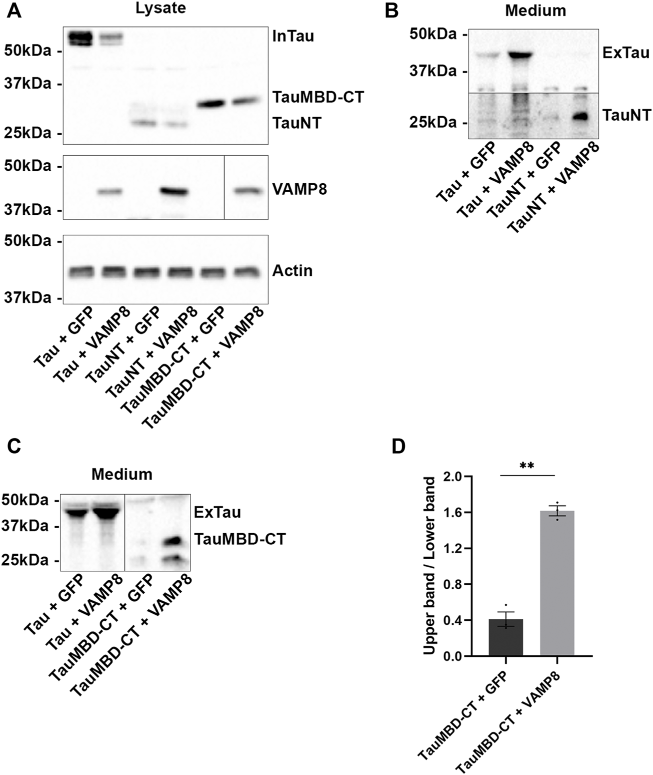 Secretion of Tau mediated by VAMP8 is independent of C-terminal cleavage. N2a cells were transfected either with Flag-Tau and GFP-empty, Flag-Tau and GFP-VAMP8, Flag-TauNT and GFP-empty, Flag-TauNT and GFP-VAMP8, Flag-TauMBD-CT and GFP-empty or Flag-TauMBD-CT and GFP-VAMP8 plasmids for 48 h. (A) Representative Western blot with the anti-FLAG antibody for intracellular signal of Tau, TauNT and TauMBD-CT. (B) Representative Western blot with the anti-Tau antibody HT7 to reveal extracellular TauNT. (C) Representative Western blot with the anti-Tau antibody A0024 to reveal extracellular TauMBD-CT. (D) Densitometry analysis of the upper band/lower band ratio for TauMBD-CT. Black frames were used to mark the splice sites of immunoblot images. n = 3. Data represent scatter plot and mean±SEM. **p < 0.01.