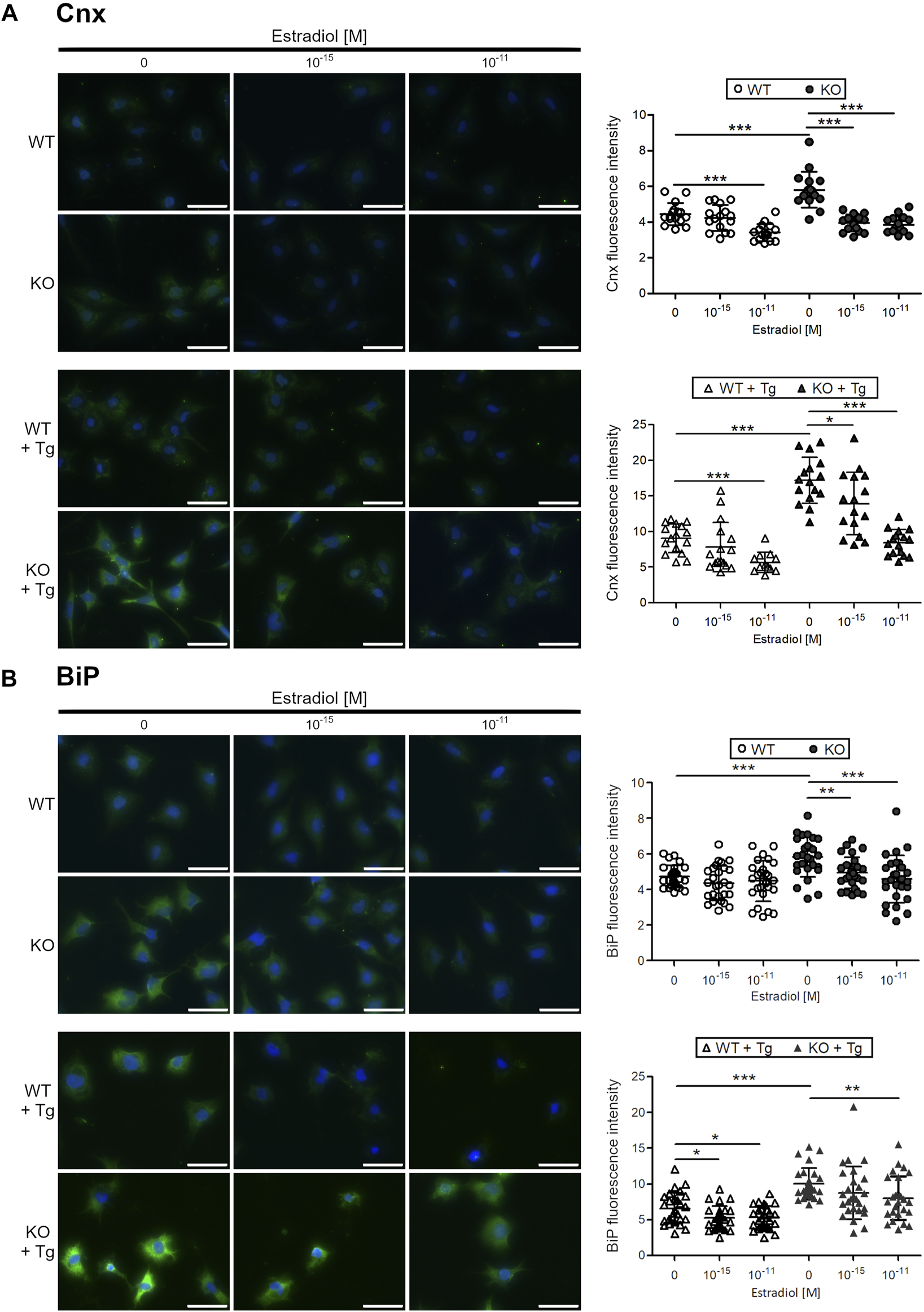 A similar experimental setup was used to test the common ER stress marker protein BiP (Figure 1B). Immunofluorescence analysis revealed that in C28/I2 WT chondrocytes, BiP fluorescence intensity was not further reduced by neither of the two estradiol concentrations (10–15 and 10–11 M). However, C28/I2 ERp57 KO cells displayed a higher BiP fluorescence intensity and both estradiol concentrations significantly decreased the BiP signal. In WT and ERp57 KO cells cultivated in presence of Tg to increase ER stress levels, estradiol reduced the BiP fluorescence intensity significantly, especially with the concentration of 10–11 M. Since it was not possible to reduce BiP by estradiol in WT chondrocytes without ER stress induction by Tg, it is likely that a certain level of ER stress is necessary for estradiol to be effective against ER stress.