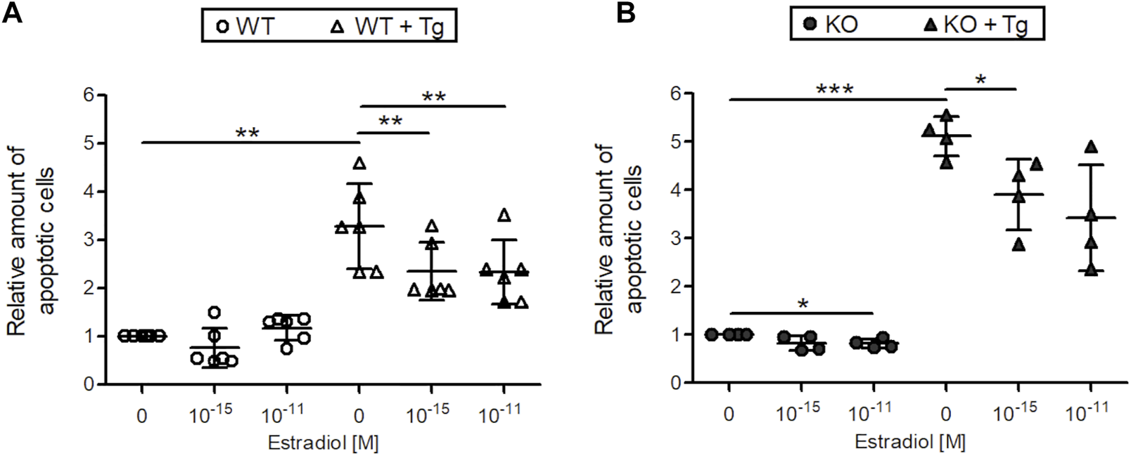 Next, the effect of 10–11 and 10–15 M estradiol on DNA strand breaks, a characteristic feature of apoptotic cells was measured by a cell death ELISA in C28/I2 WT and C28/I2 ERp57 KO cells (Figure 2). Without induction of ER stress with Tg, the number of apoptotic cells in both samples is very low. Nevertheless, apoptosis in C28/I2 ERp57 KO cells was reduced by 10–11 M estradiol. In WT and KO cells with high ER stress due to induction with Tg, the number of apoptotic cells was clearly increased and estradiol led to a dose-dependent inhibition of apoptosis. These results suggest that estradiol not only inhibits ER stress but also reduces ER stress-induced apoptosis in chondrocytes.