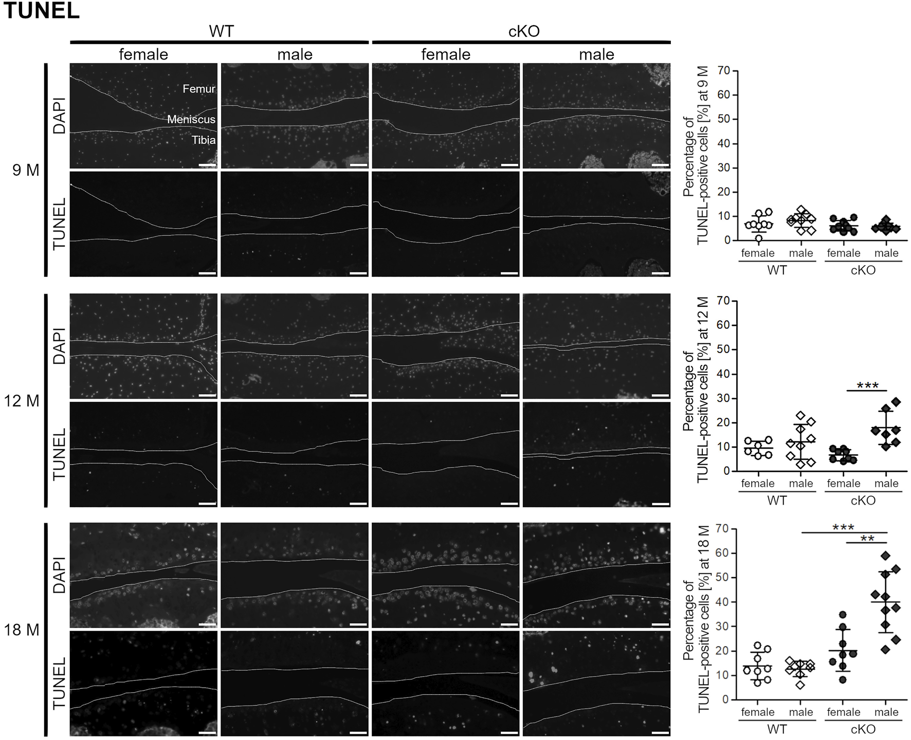 Female mice develop less apoptotic cells during ageing compared to male mice. TUNEL staining reveals a higher percentage of apoptotic cells in the knee sections of 12 months old male ERp57 cKO mice, while female mice remain on a low level (p = 0.00069). This difference is even increased at the age of 18 months (p = 0.00161,699). Then, male cKO mice additionally have significantly higher numbers of apoptotic cells than male WT mice (p = 0.00001840). Joint surfaces are highlighted. Scale bars = 50 μm, M = months.