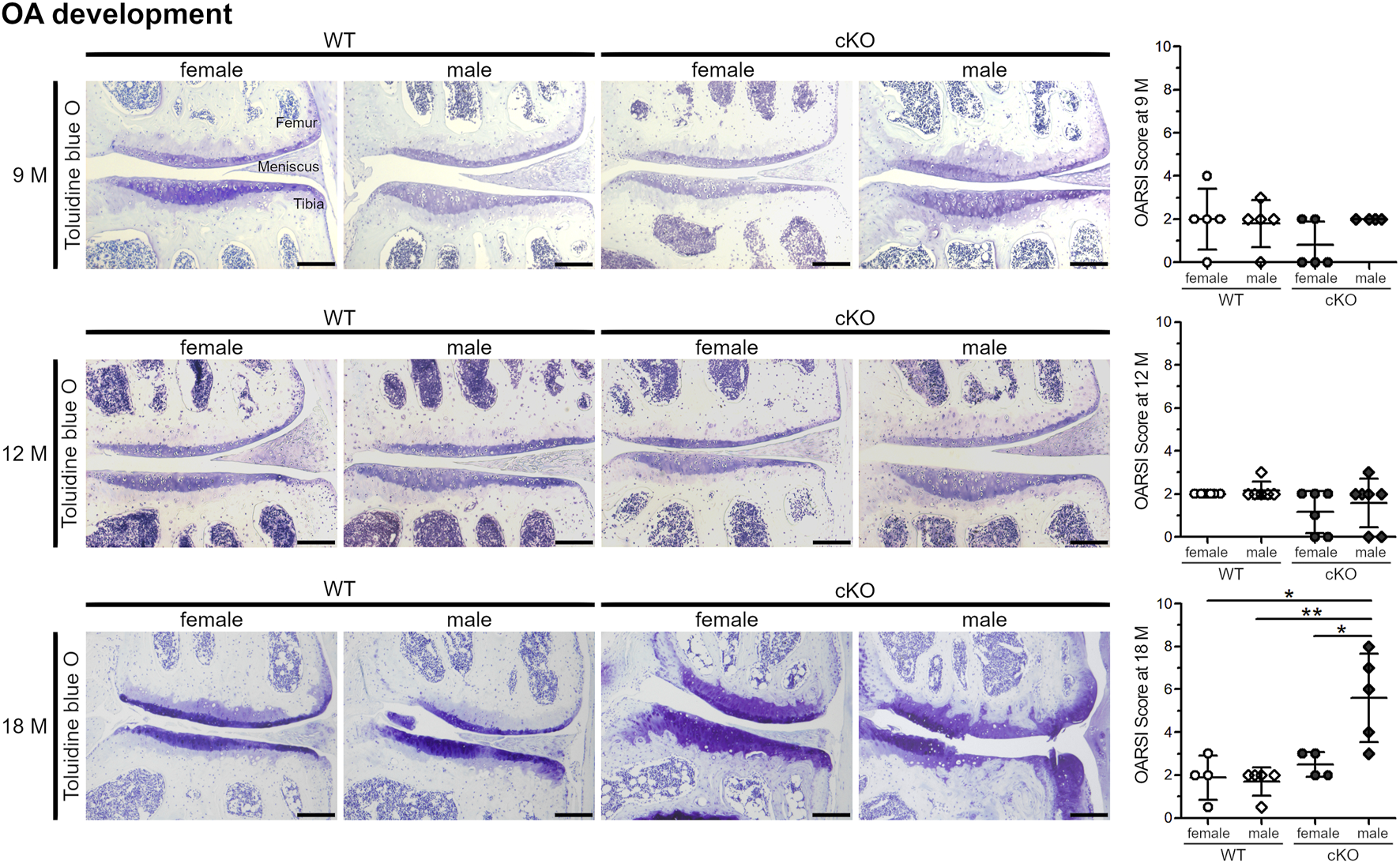 Male ERp57cKO mice develop strong signs of OA during ageing. At the age of 18 months, OARSI scoring of toluidine blue O-stained knee sections reveals an increase of cartilage degradation, including osteophyte formation in male cKO mice, but not in female cKO mice (p = 0.0241313), nor female WT (p = 0.01398420) or male WT mice (p = 0.00394253). At earlier timepoints (9 and 12 M), no difference between the sexes or genotypes is observed. Scale Bar = 100 μm, M = months.