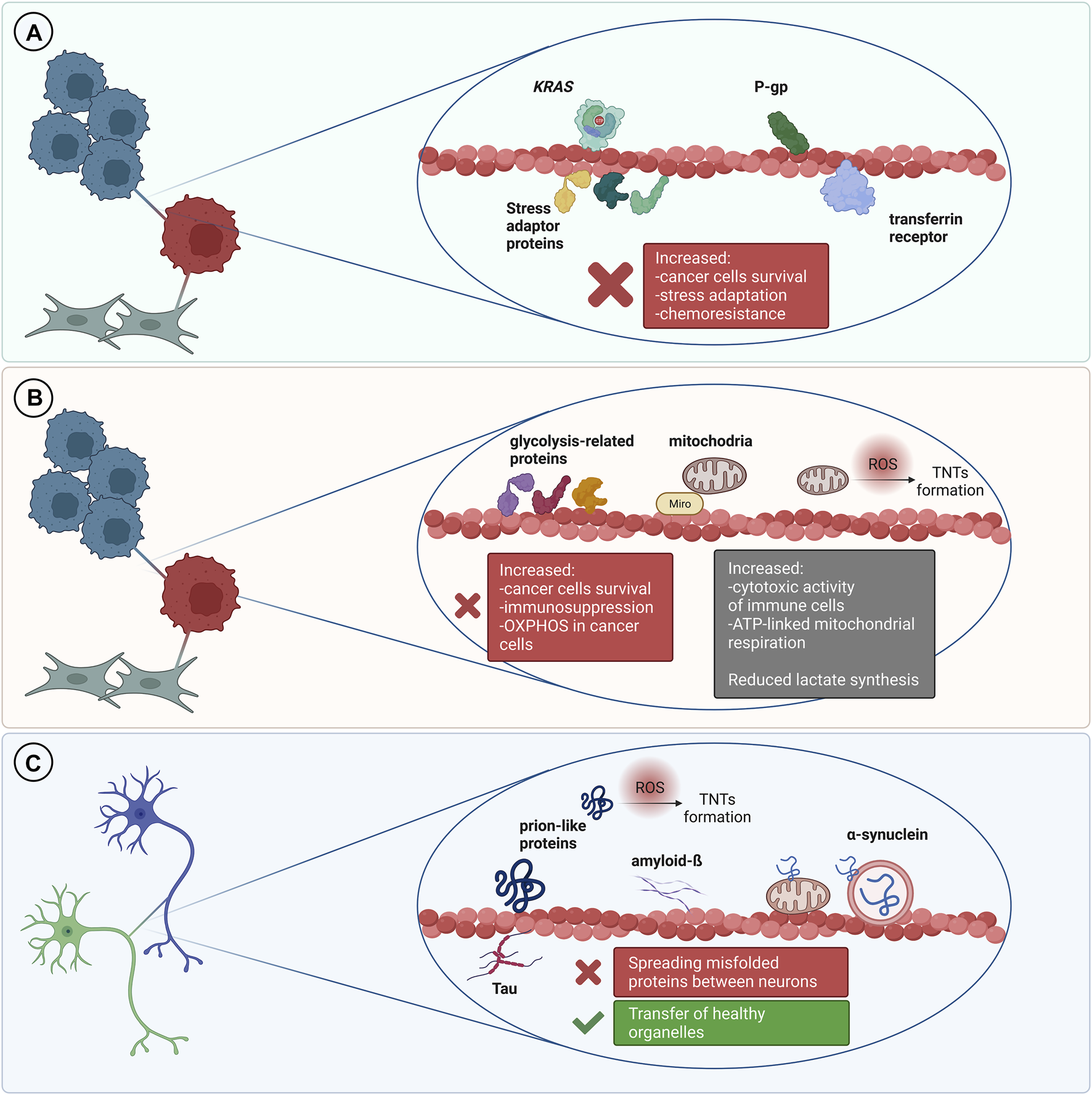FIGURE 2. TNT-mediated transfer of various proteins and its outcomes. (A) In the cancer microenvironment it is usually associated with cancer progression and increased chemoresistance. (B) Transfer of metabolic-related proteins and mitochondria may result in increased immunosuppression but it can also be a cause of increased cytotoxic activity of immune cells. Transfer of mitochondria to cancer cells is often associated with increased chemoresistance and cancer progression. (C) TNT can mediate transfer of misfolded proteins between cells in the nervous system which leads to progression of neurodegenerative disorders. On the other hand, TNT can be a route for the transmission of healthy organelles as a rescue mechanism.