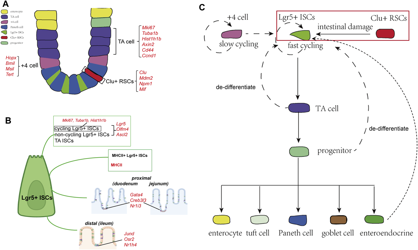 Cellular components and the derivation or differentiation of intestinal epithelium. (A) Architecture and cellular components of the intestinal epithelium. The intestinal epithelium folds into millions of crypts and villi. Rapidly dividing ISCs reside at the bottom of the crypt, giving rise to TA cells that finally differentiate into five different mature intestinal epithelial cell types: enterocytes, Paneth cells, goblet cells, EECs, and tuft cells. Clu+ RSCs are extremely rare under homoeostatic conditions and can repopulate the pool of Lgr5+ ISCs. (B) Landmark genes of Lgr5+ ISCs based on single-cell sequencing results. Cycling and non-cycling Lgr5+ populations strongly expressed canonical CBC genes (Lgr5, Olfm4, and Ascl2). Cell cycle mRNAs (Mki67, Tuba1b, and Hist1h1b) are specifically segregated to cycling Lgr5+ cells. Moreover, two Lgr5+ ISCs subtypes that specifically expressed MHCII are identified by scRNA-sq. Lgr5+ ISCs in different regions of the intestinal tract express region-specific marker genes. (C) The derivation and differentiation of ISCs. ISCs in crypts can replenish the whole crypt-villus axis, generating all differentiated cell types required for the physiological function of the intestine.