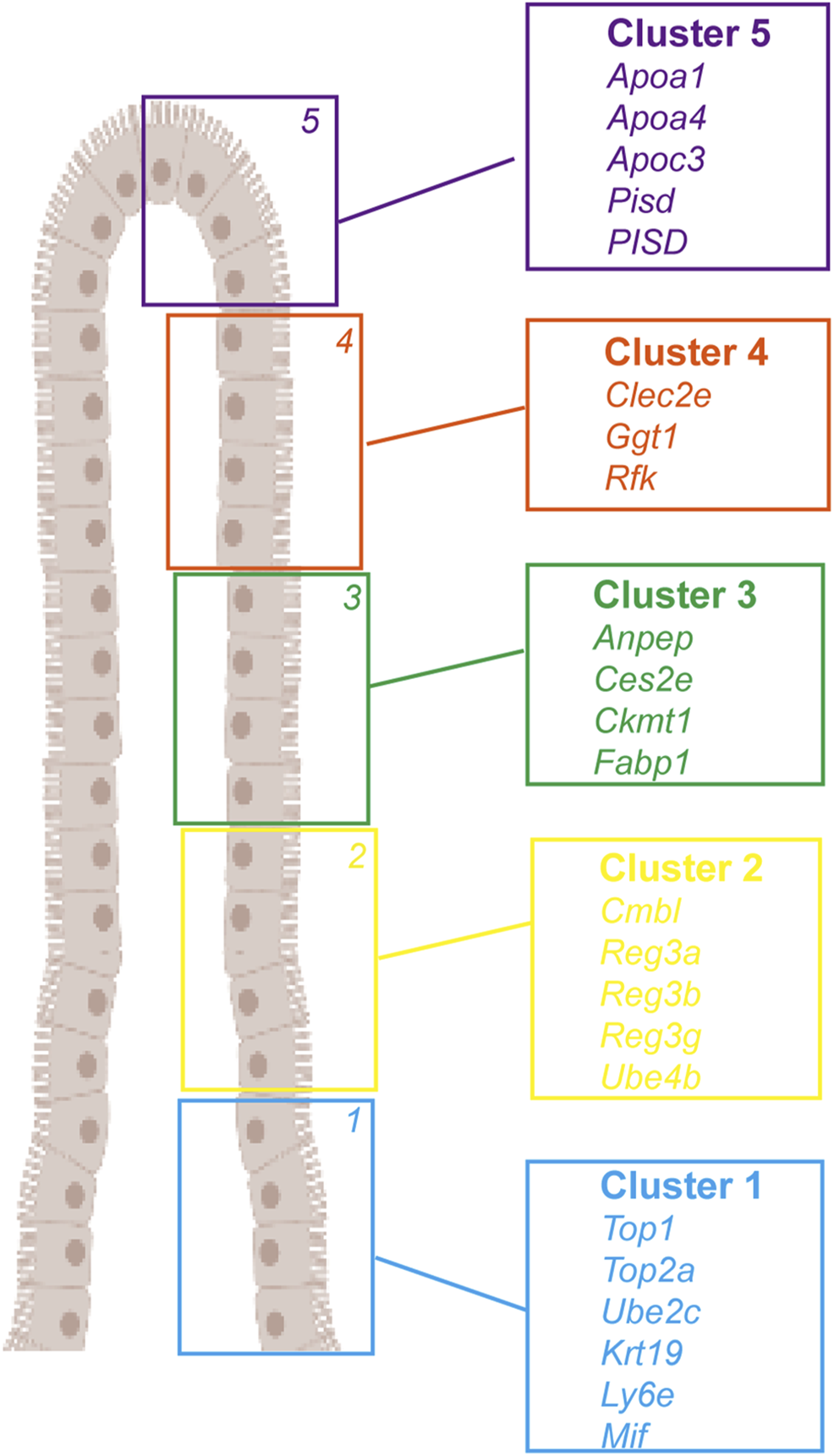 Landmark genes of enterocyte along the villus. A large panel of landmark genes uncovers broad zonation of enterocyte function along the villus. Cluster 1: Top1, Top2a, Ube2c, Krt19, Ly6e, and Mif. Cluster 2: Cmbl, Reg3a, Reg3b, Reg3g, and Ube4b. Cluster 3: Anpep, Ces2e, Ckmt1, and Fabp1. Cluster 4: Clec2e, Ggt1, and Rfk. Cluster 5: Apoa1, Apoa4, Apoc3, Pisd, and PISD).
