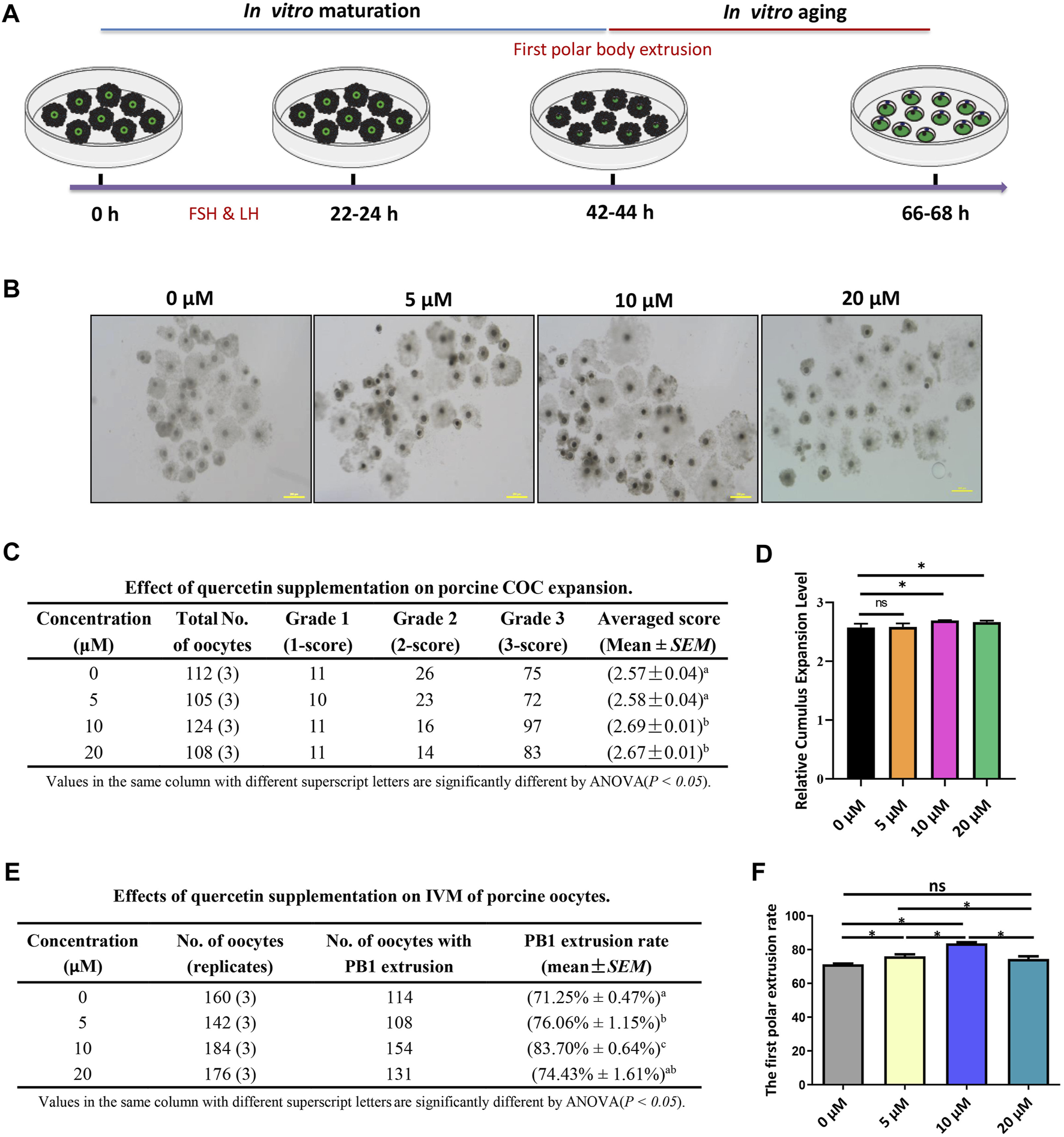 FIGURE 1. Quercetin supplementation improves the in vitro maturation (IVM) of porcine oocytes. (A) Diagram of IVM and aging of porcine oocytes. (B) Representative images of 0, 5, 10, and 20 μM QUE on porcine cumulus oocyte complex (COC) expansion (n = 449). (C) Effect of QUE on porcine COC expansion. Analysis of variance (ANOVA) of different superscript letter values in the same column is significantly different (p < 0.05) (n = 662). (D) Statistical analysis of the effects of different concentrations of QUE on porcine COC expansion. The symbol * indicates significant difference at the 0.05 level (p < 0.05); the symbol “ns” indicates no significant differences between the two groups (p > 0.05). (E) Effects of different concentrations of QUE on porcine oocyte IVM. ANOVA of different superscript letter values in the same column is significantly different (p < 0.05). (F) Statistical analysis of the effects of different concentrations of QUE on porcine oocyte IVM. At least three separate experiments were performed, and the data are shown as the mean ± standard error of the mean (SEM). Scale bar = 200 μm. The symbol * indicates significant difference at the 0.05 level (p < 0.05).