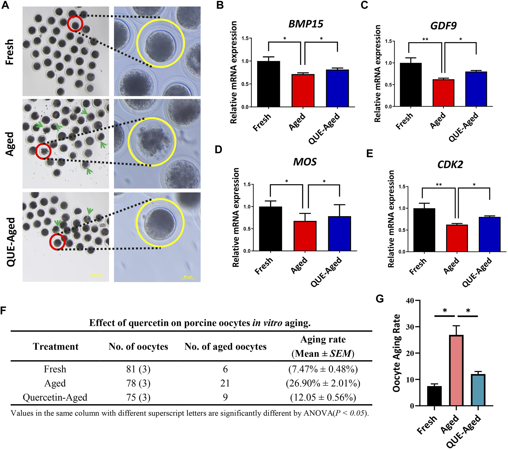 FIGURE 2. QUE supplementation inhibits the deterioration of the quality of the in vitro aged porcine oocytes. (A) Representative images of oocytes in fresh, aged, and QUE-aged groups. The abnormal cytoplasm of oocytes is marked with blue arrows. Scale bar = 200 μm in the left panel; Scale bar = 50 μm in the right panel. Expression levels of BMP15 (B), GDF9 (C), MOS (D) and CDK2 (E) in porcine oocytes of fresh, aged, and QUE-aged groups after 24 h of aging treatment. (F) QUE could protect oocytes from aging. ANOVA of different superscript letter values in the same column is significantly different (p < 0.05) (n = 234). (G) Statistical analysis of the effects of different concentrations of QUE on porcine oocytes in in vitro aging. The symbol * indicates significant difference at the 0.05 level (p < 0.05); and the symbol ** indicates significant difference at the 0.05 level (p < 0.01).