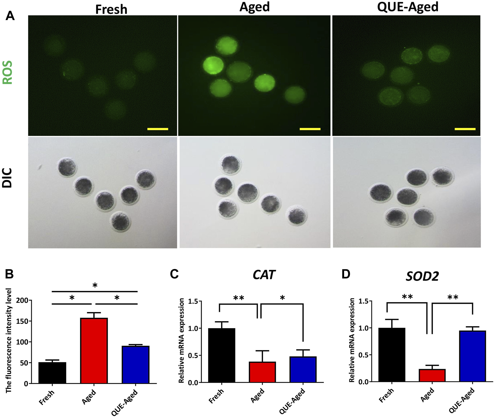 FIGURE 3. QUE reduces the oxidative stress in aged porcine oocytes. (A) Representative images of oocytes in fresh, aged, and QUE-aged groups stained with 2′, 7′-dichlorodihydrofluorescein diacetate (DCFH-DA) (n = 54). Scale bar = 200 μm. (B) Quantitative analysis of reactive oxygen species (ROS) levels in porcine oocytes of fresh, aged, and QUE-aged groups based on the intensity of the fluorescence signal. (C) Expression levels of catalase (CAT) in porcine oocytes of fresh, aged, and QUE-aged groups after 24 h of aging treatment. The symbol * indicates significant difference at the 0.05 level (p < 0.05), and the symbol ** indicates significant difference at the 0.05 level (p < 0.01). (D) Expression levels of superoxide dismutase 2 (SOD2) in porcine oocytes of fresh, aged, and QUE-aged groups after 24 h of aging treatment. The symbol * indicates significant difference at the 0.05 level (p < 0.05), and the symbol ** indicates significant difference at the 0.05 level (p < 0.01).