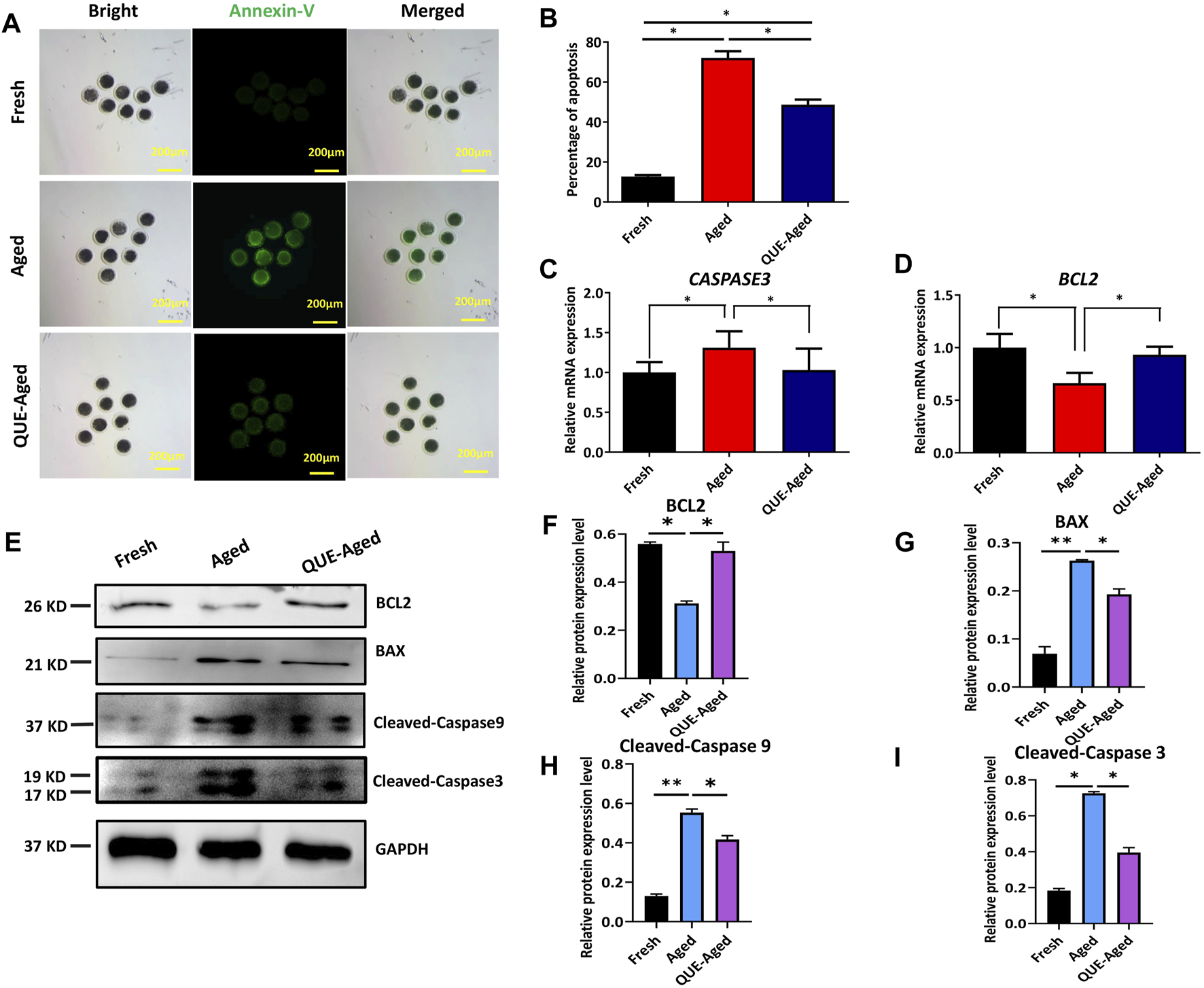 FIGURE 5. QUE inhibits the early apoptosis of aged porcine oocytes. (A) Representative images of annexin-V staining of porcine oocytes of fresh, aged, and QUE-aged groups. Scale bar = 200 μm. (B) Analysis of the ratio in porcine oocytes of fresh, aged, and QUE-aged groups (n = 470). The symbol * indicates significant difference at the 0.05 level (p < 0.05). (C) Expression levels of CASPASE3 in porcine oocytes of fresh, aged, and QUE-aged groups after 24 h of aging treatment. The symbol * indicates significant difference at the 0.05 level (p < 0.05). (D) Expression levels of B-cell lymphoma-2 (BCL2) in porcine oocytes in fresh, aged, and QUE-aged groups after 24 h of aging treatment. The symbol * indicates significant difference at the 0.05 level (p < 0.05). (E) Western blotting analysis of BCL2, Bcl-2-associated X (BAX), cleaved caspase 3, and cleaved caspase 9 protein levels in fresh, aged, and QUE-aged groups (n = 600). (F) Expression levels of BCL2 in porcine oocytes of fresh, aged, and QUE-aged groups. The symbol * indicates significant difference at the 0.05 level (p < 0.05). (G) Expression levels of BAX in porcine oocytes of fresh, aged, and QUE-aged groups. The symbol * indicates significant difference at the 0.05 level (p < 0.05). (H) Expression levels of cleaved caspase 9 in porcine oocytes of fresh, aged, and QUE-aged groups. The symbol * indicates significant difference at the 0.05 level (p < 0.05). (I) Expression levels of cleaved caspase 3 in porcine oocytes of fresh, aged, and QUE-aged groups. The symbol * indicates significant difference at the 0.05 level (p < 0.05).