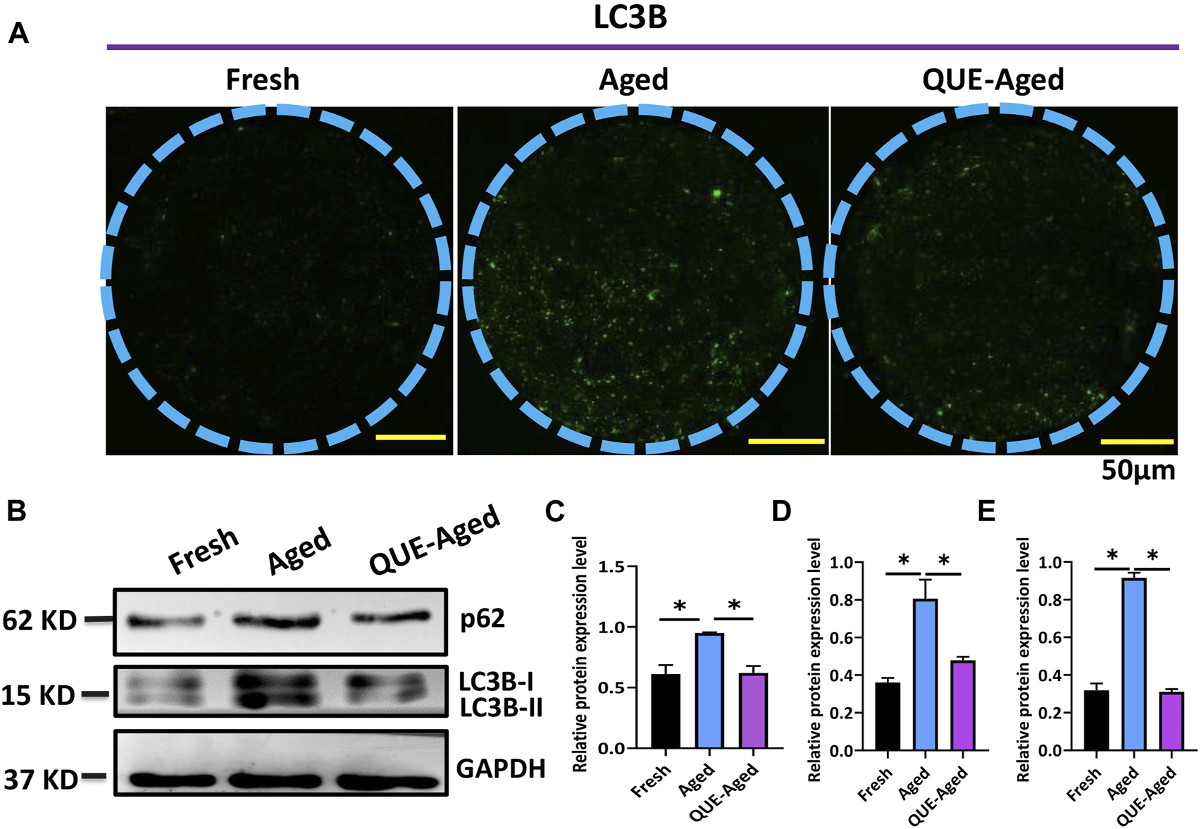 FIGURE 6. QUE attenuates the autophagic activity in aged porcine oocytes. (A) Representative images of fresh, aged, and QUE-aged groups stained with LC3B. Scale bar = 50 μm. (B) Western blotting analysis of LC3B and p62 protein levels in fresh, aged, QUE-aged groups (n = 600). (C) Expression levels of p62 in porcine oocytes of fresh, aged, and QUE-aged groups. The symbol * indicates significant difference at the 0.05 level (p < 0.05). (D) Expression levels of LC3B-I in porcine oocytes of fresh, aged, and QUE-aged groups. The symbol * indicates significant difference at the 0.05 level (p < 0.05). (E) Expression levels of LC3B-II in porcine oocytes of fresh, aged, and QUE-aged groups (n = 200). The symbol * indicates significant difference at the 0.05 level (p < 0.05).