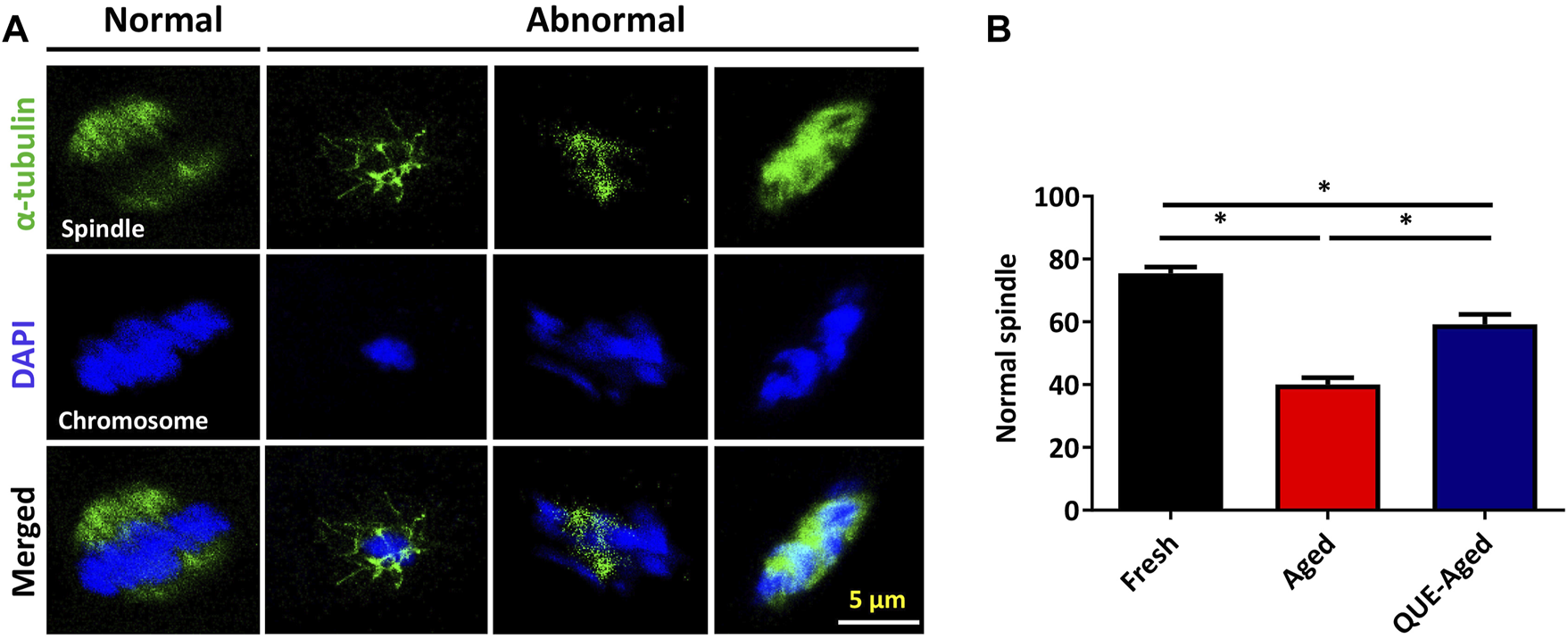 FIGURE 7. QUE reduces the spindle abnormalities in aged porcine oocytes. (A) Representative immunofluorescent figures of normal and abnormal spindle morphologies and chromosome alignment in fresh, aged, and QUE-aged groups. Scale bar = 5 μm. (B) Percentage of the normal spindle in porcine oocytes of fresh, aged, and QUE-aged groups. The symbol * indicates significant difference at the 0.05 level (p < 0.05).